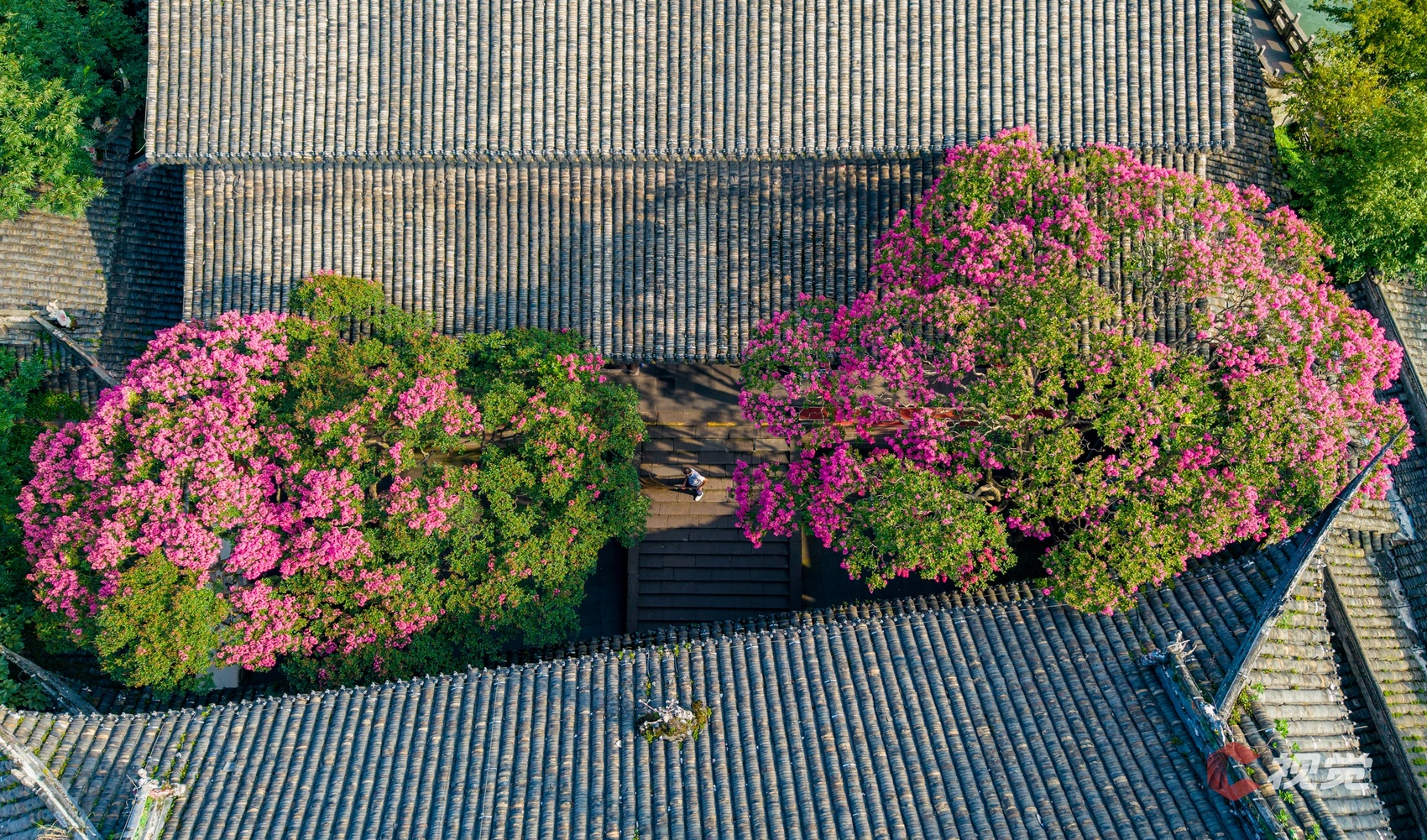 入伏之后,夏日限定的紫薇就开启了繁花模式,浅粉与绛红的紫薇花缀满枝头,在都江堰二王庙和伏龙观的古朴飞檐下、绵阳平武报恩寺的红墙旁、崇州罨画池的碧波边,百年紫薇花如云霞版绽放,宛如诗意雅致的锦缎,妆点着红墙黛瓦的千年古建,成为市民游客消暑赏景的好去处。
