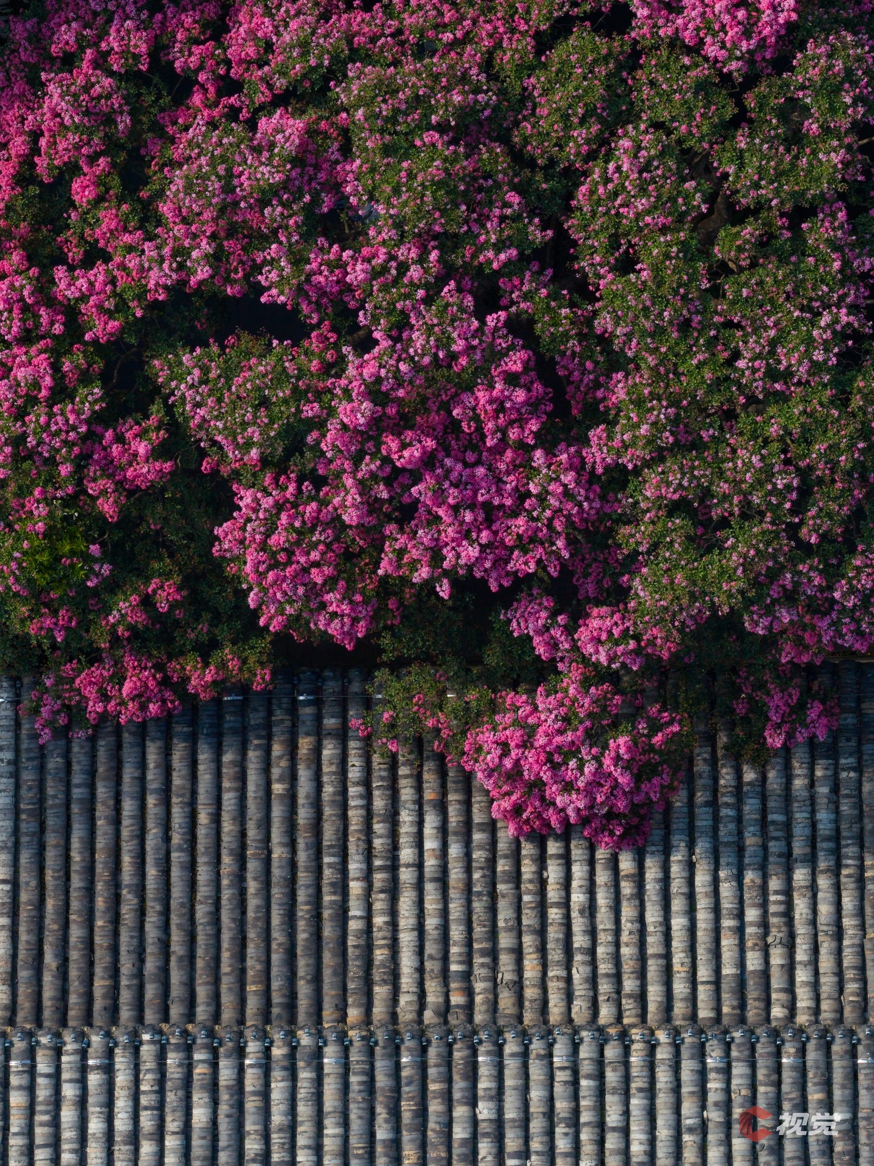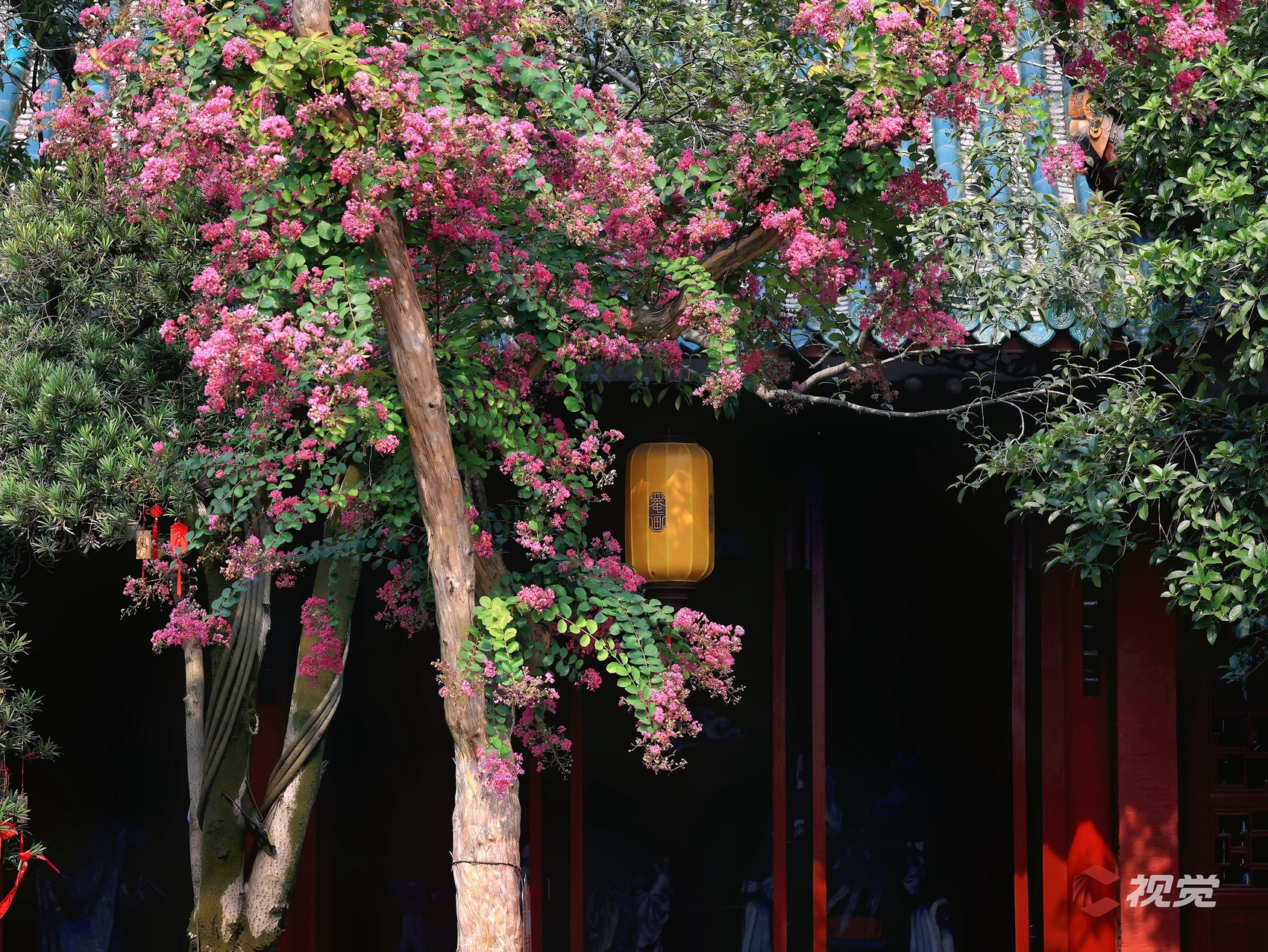 都江堰伏龙观内,阳光照耀下的紫薇花盛开如瀑,如诗如画。C视觉签约摄影师 韦洪涛