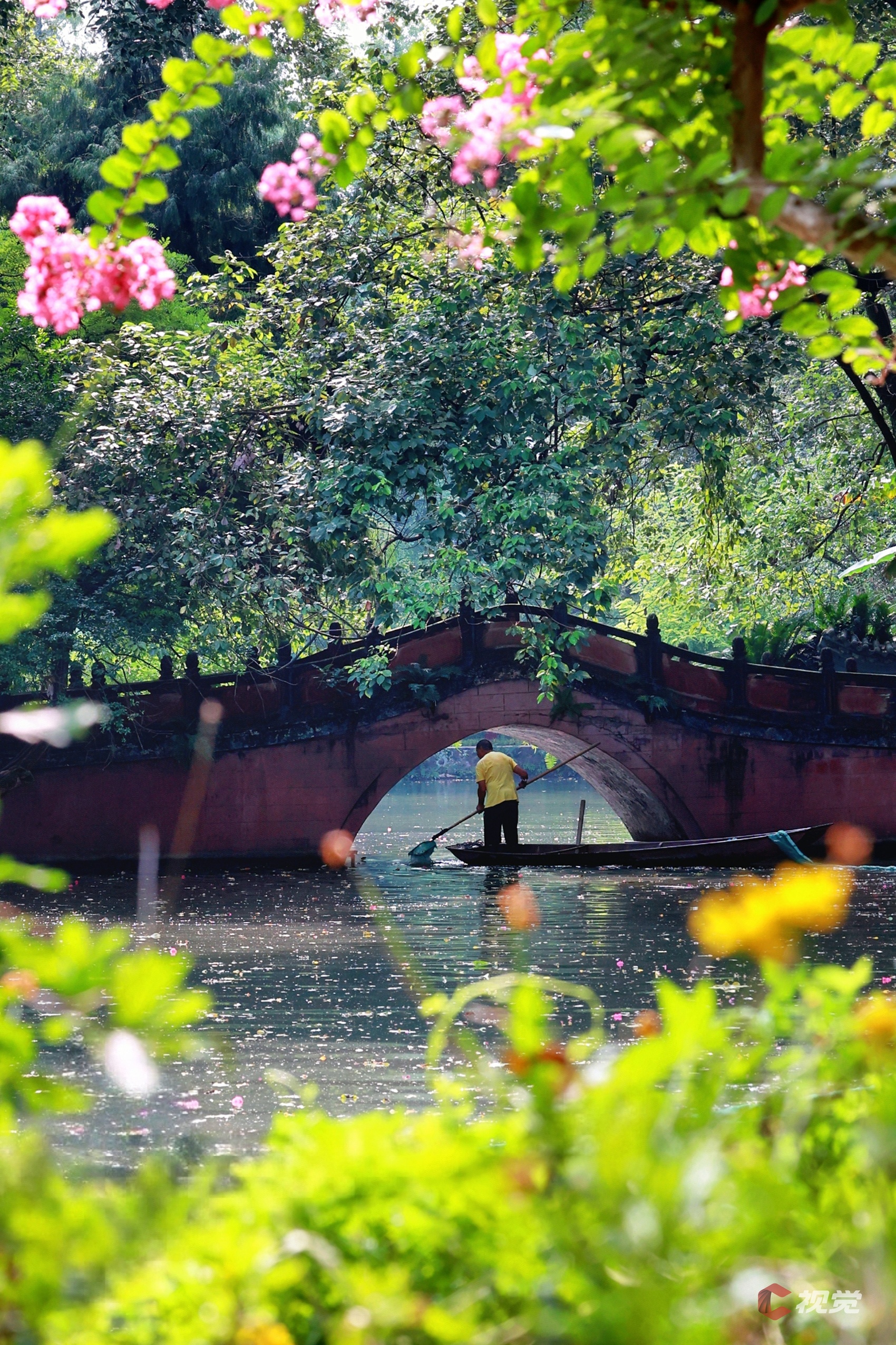 崇州千年名园罨画池内,紫薇倒映水面,清洁工人正在池中清理垃圾。C视觉签约摄影师 朱志宏