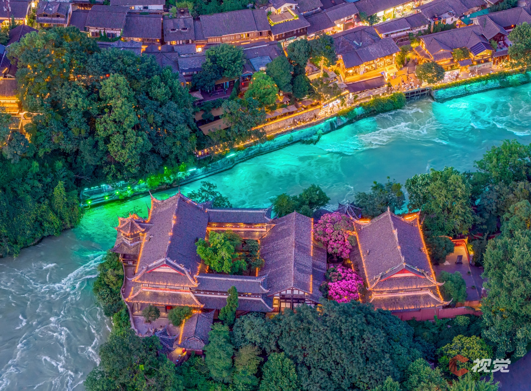 夜幕下,都江堰伏龙观紫薇花与“蓝眼泪”交相辉映。C视觉签约摄影师 陈和勇