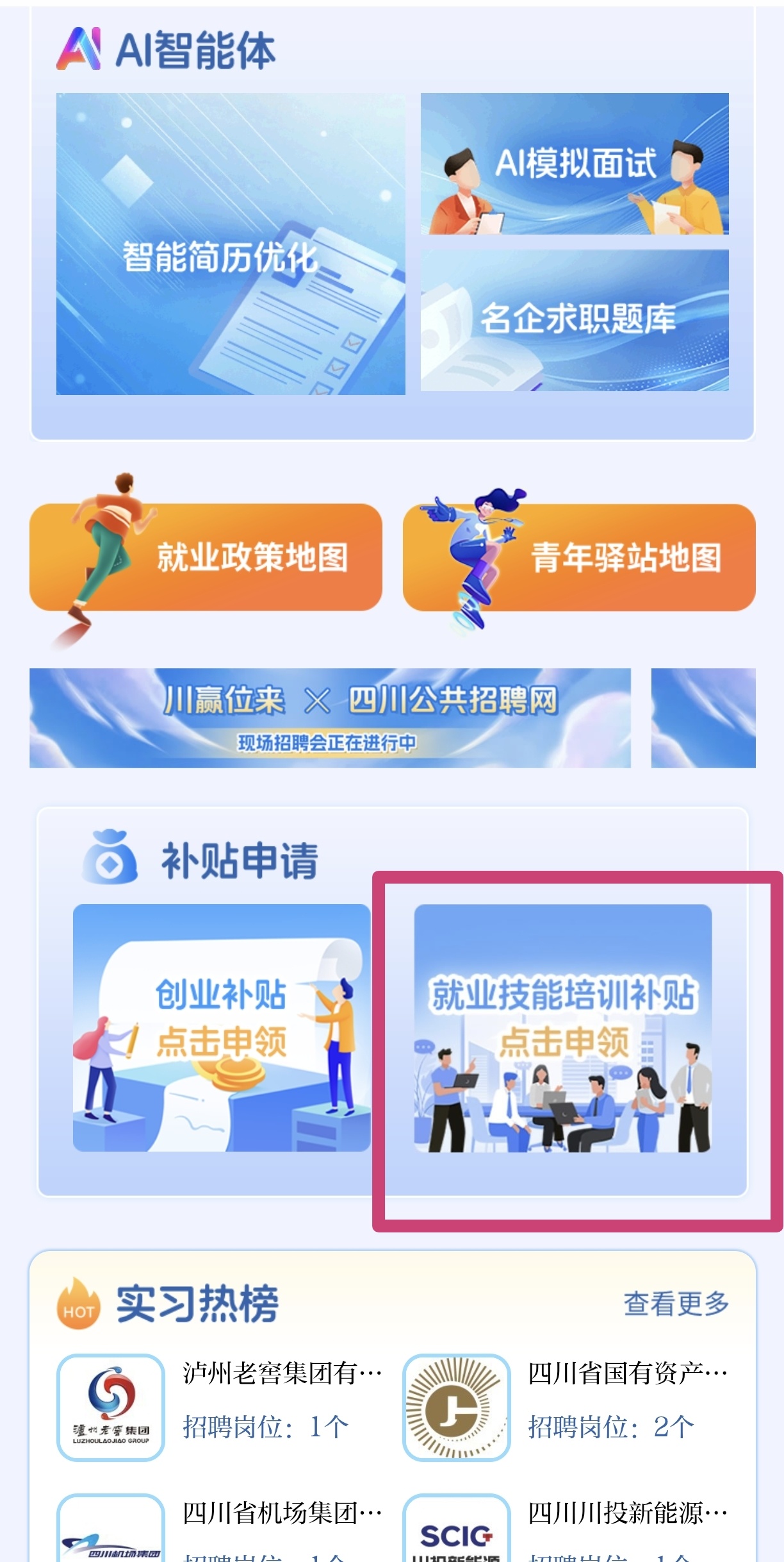 8月6日,“川赢位来”青年就业创业综合服务平台上新“就业技能培训补贴”申领功能,方便爱学习又符合条件的你通过平台快捷申领。