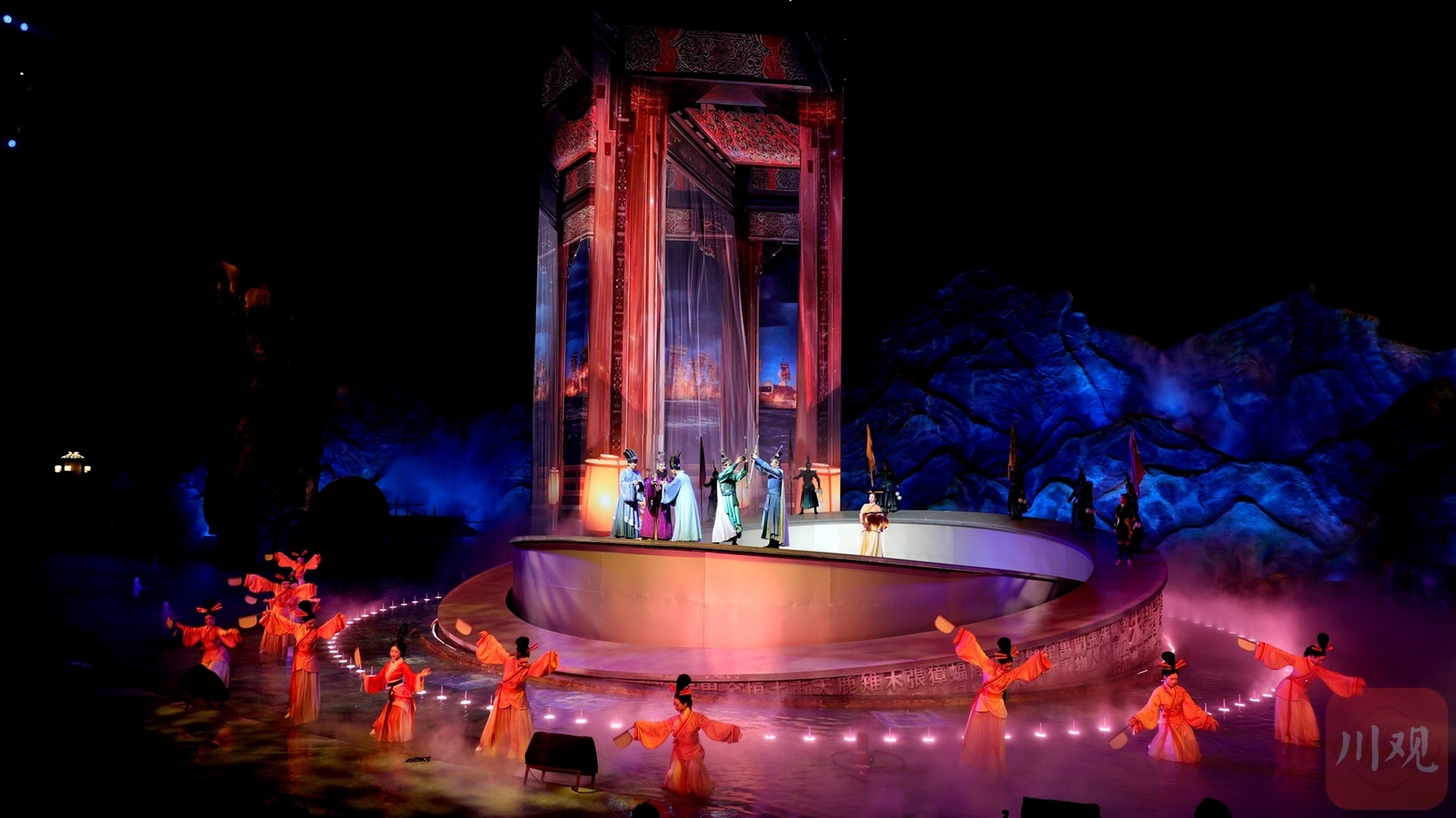 《三国“眼”绎》超验秀,以蜀道三国文化为基底,结合剑门关的地理位置和文化背景,运用当代审美语境和历史视角,融合“眼”状造型水舞台、酷炫灯光、喷火特效、升降舞台和超大型视觉演绎空间,为观众带来震撼的视觉盛宴。