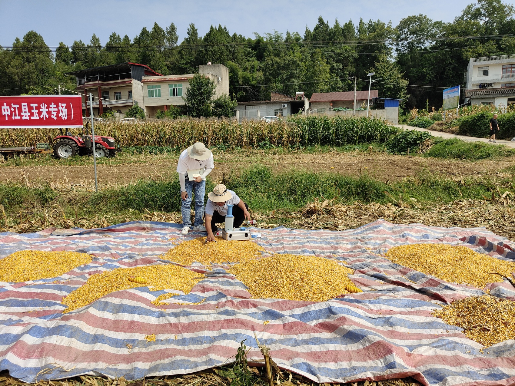 现场展示不同收割机收获的玉米籽粒。