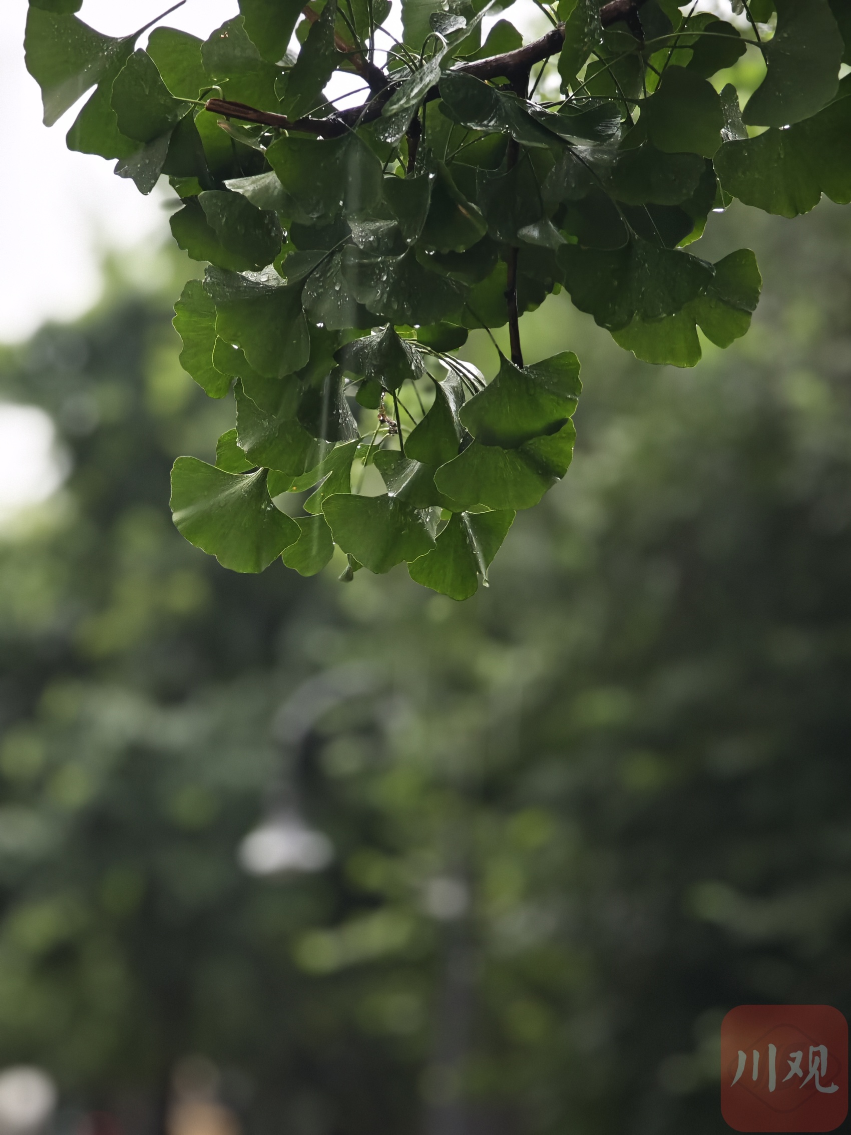 雨中的银杏树树叶变得翠绿。