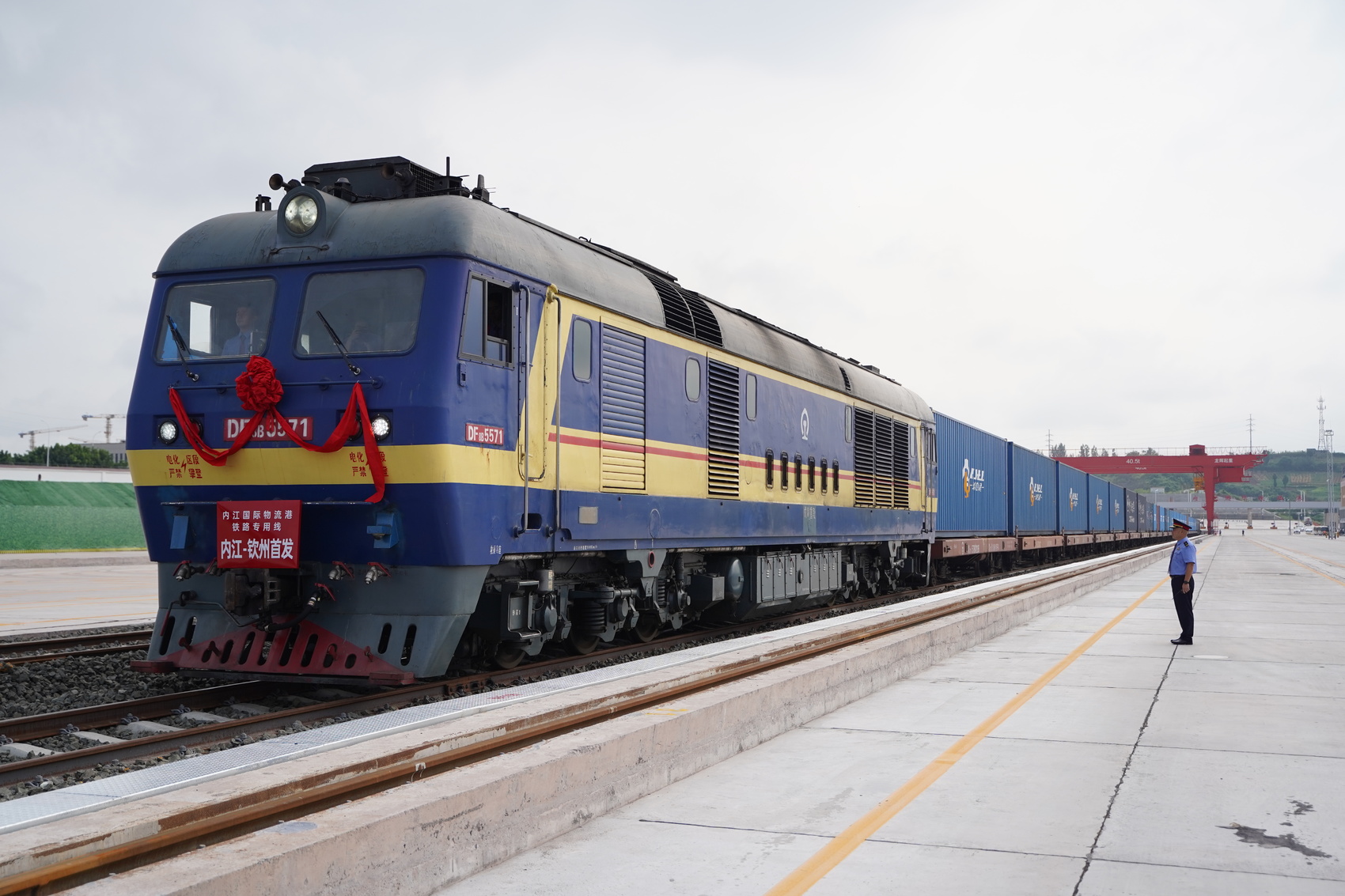 发车现场,内江车务段内江南站站长唐刚介绍,当天首发的内江-钦州国际货运列车共装载54个标准集装箱,搭载“内江造”的柴油机、硫酸铵等货品,行经两天时间抵达广西钦州港,再转海运,两周后最终抵达越南胡志明市。