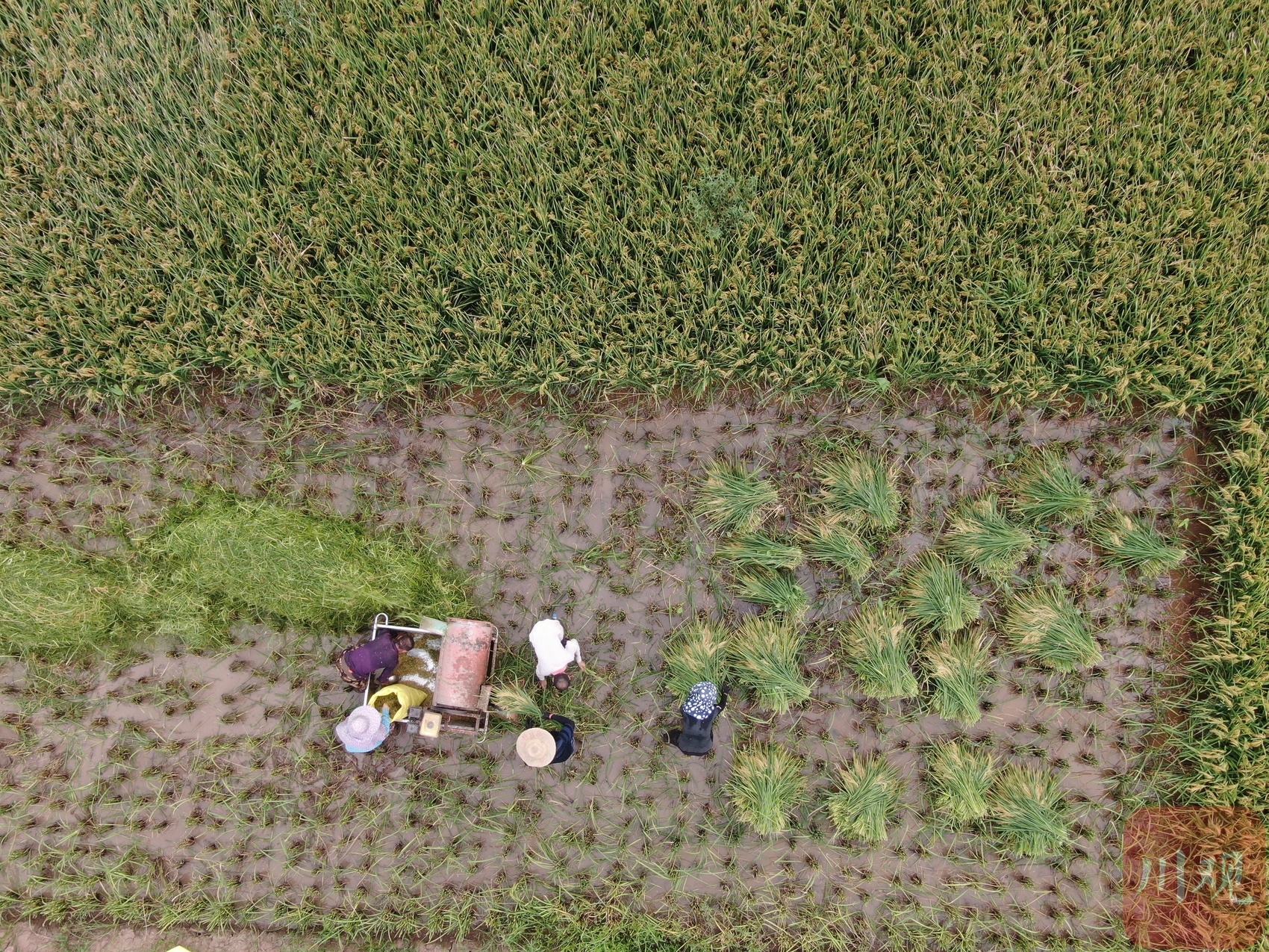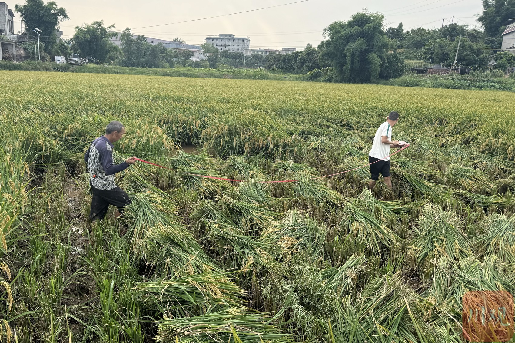 四川农业大学水稻研究所教授孙永健、南充市农业技术推广站副站长罗友明分在了第二组,负责中产田块。在村民们的协助下,收割、脱粒、装袋等工序很快完成。孙永健、罗友明二人下田,拉起皮尺,经多次测量后,计算出田块收割部分的面积。