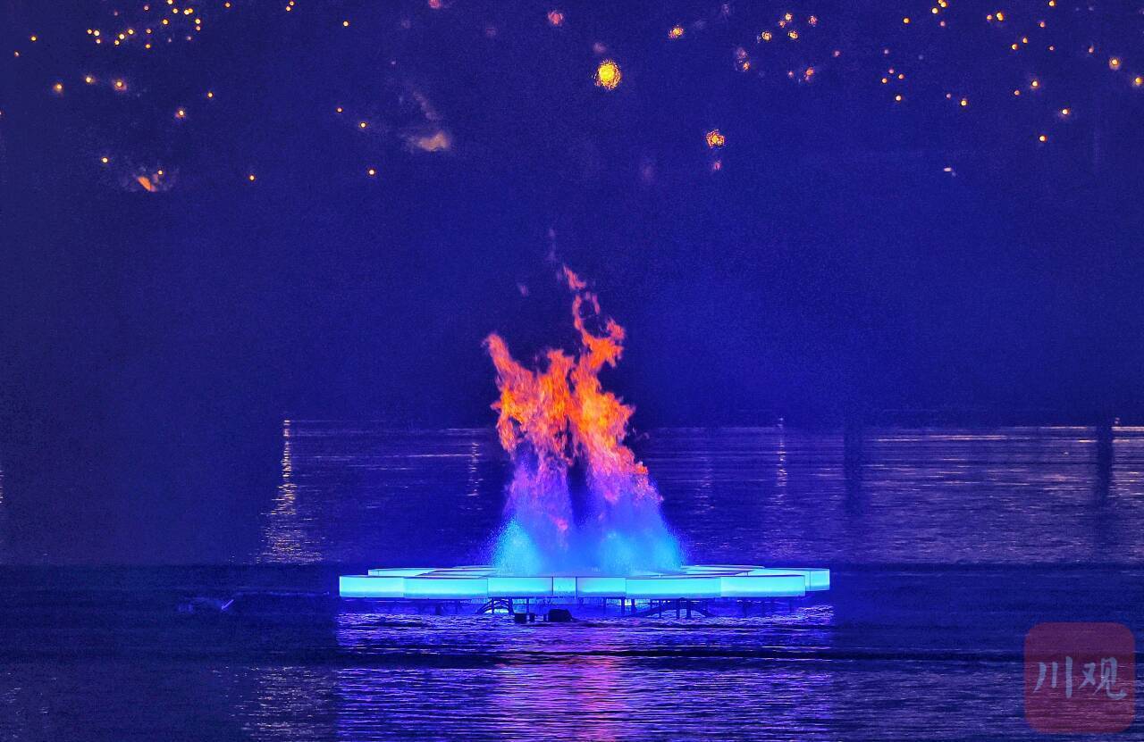 这一刻全场沸腾。火炬“竹梦”成功点燃世运会史上首个湖面火炬塔,水火交融的奇观辉映蓉城夜空。