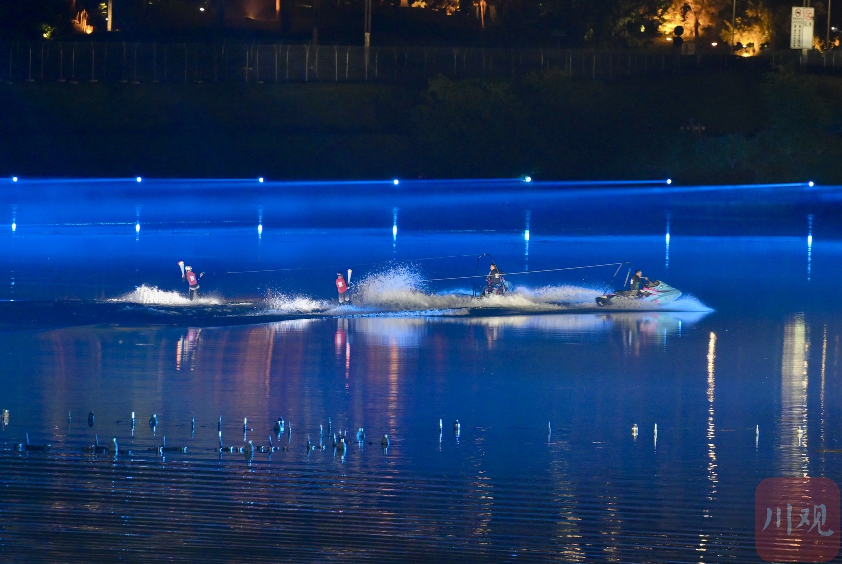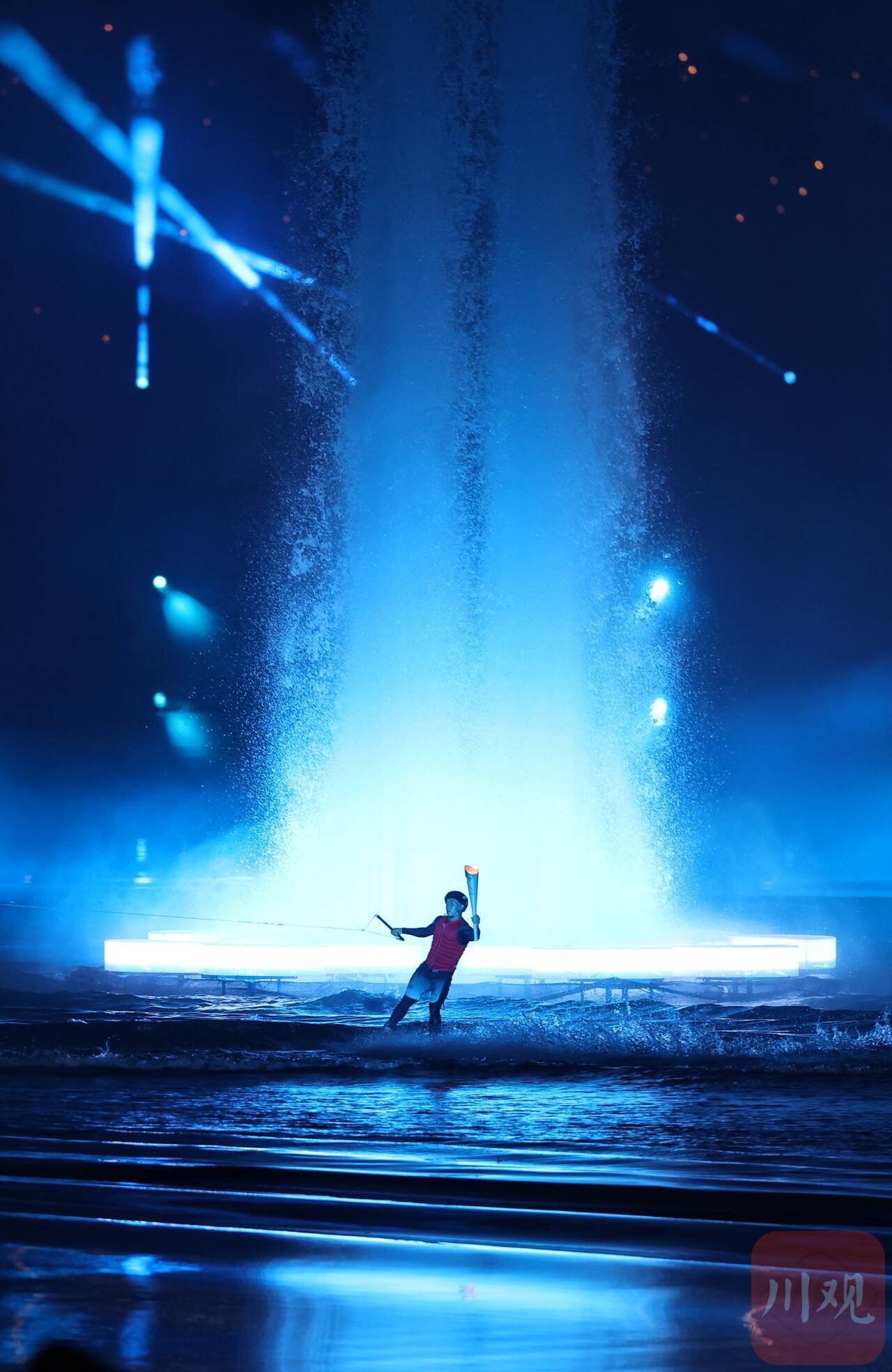 此时的湖面中,本届世运会会徽形状的点火台逐渐亮起,冉冉水柱从中喷涌而出,在空中汇聚成火炬塔。最后,两位点火手从台边划过时,灯光瞬时切换,涌动的水柱顶端,熊熊火光燃起。