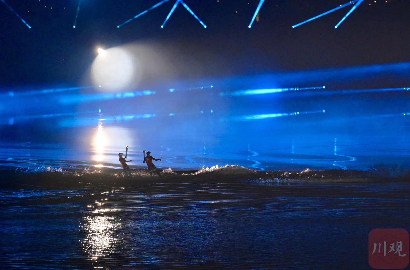 点燃火炬塔的方式也极有新意,充满运动元素和四川元素。导演团队介绍,首先尾波冲浪本来就是本次世运会的比赛项目,其次,两位点火手都为四川籍,在火焰燃烧的那一刻,他们放低身体,在水面上画出一个“爱心”,也诠释了人与自然、运动与和平的深刻联结。