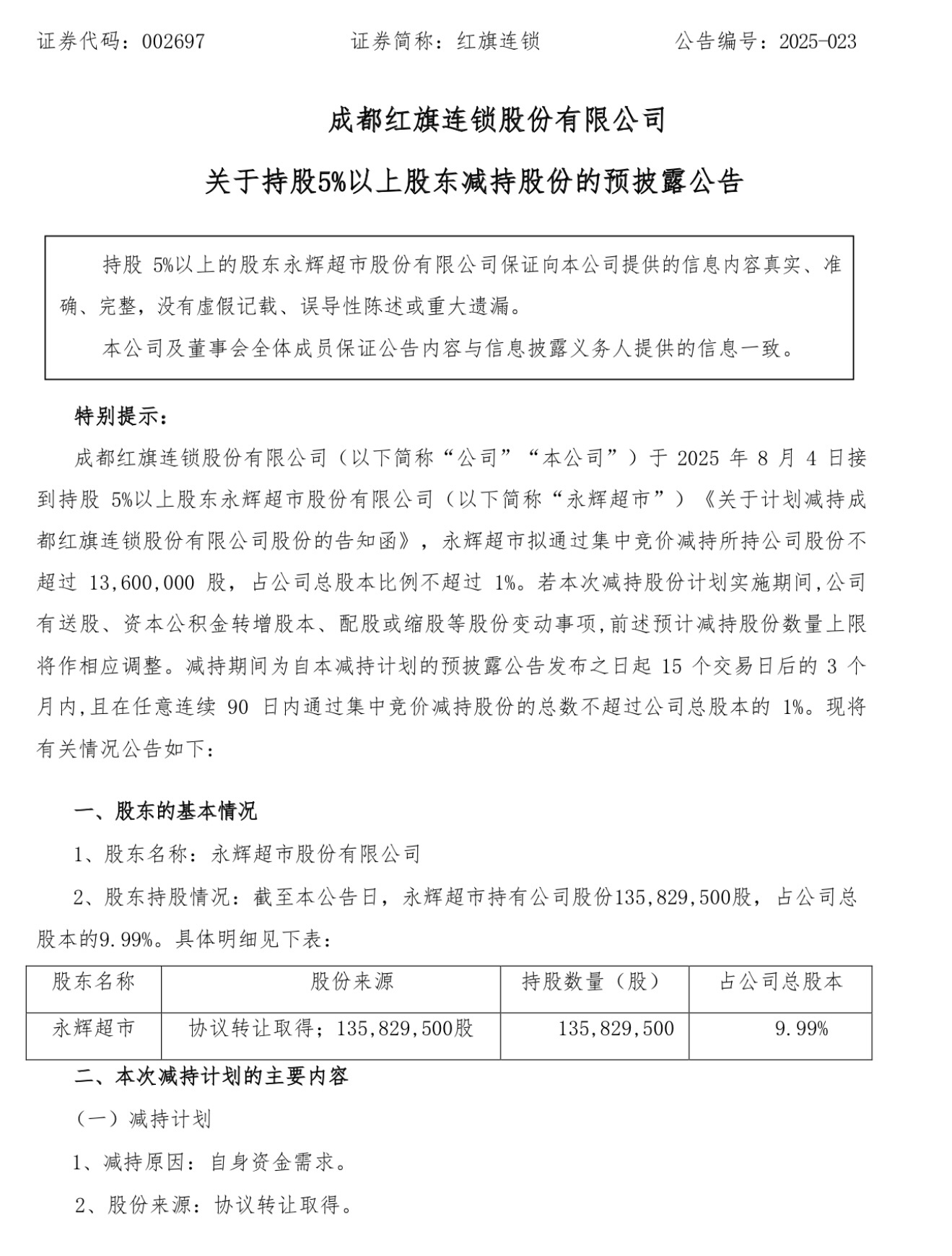 红旗连锁在8月4日还发布预披露公告称,持股5%以上股东永辉超市(601933.SH)因自身资金需求,计划自该公告发布之日起15个交易日后的3个月内,且在任意连续90日内通过集中竞价减持所持公司股份不超过1360万股,占公司总股本比例不超过1%。