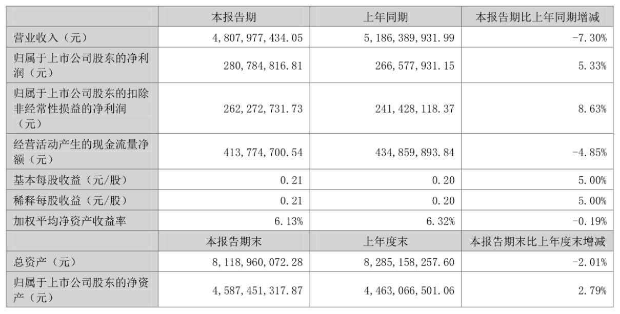 今年上半年,红旗连锁公司营业收入为48.1亿元,同比下降7.3%;实现含税销售额53.65亿元,同比减少7.3%,归母净利润实现逆势增长,为2.81亿元,同比增长5.33%;扣非归母净利润为2.62亿元,同比上升8.6%;经营现金流净额为4.14亿元,同比下降4.8%;每股收益(全面摊薄)为0.2065元。