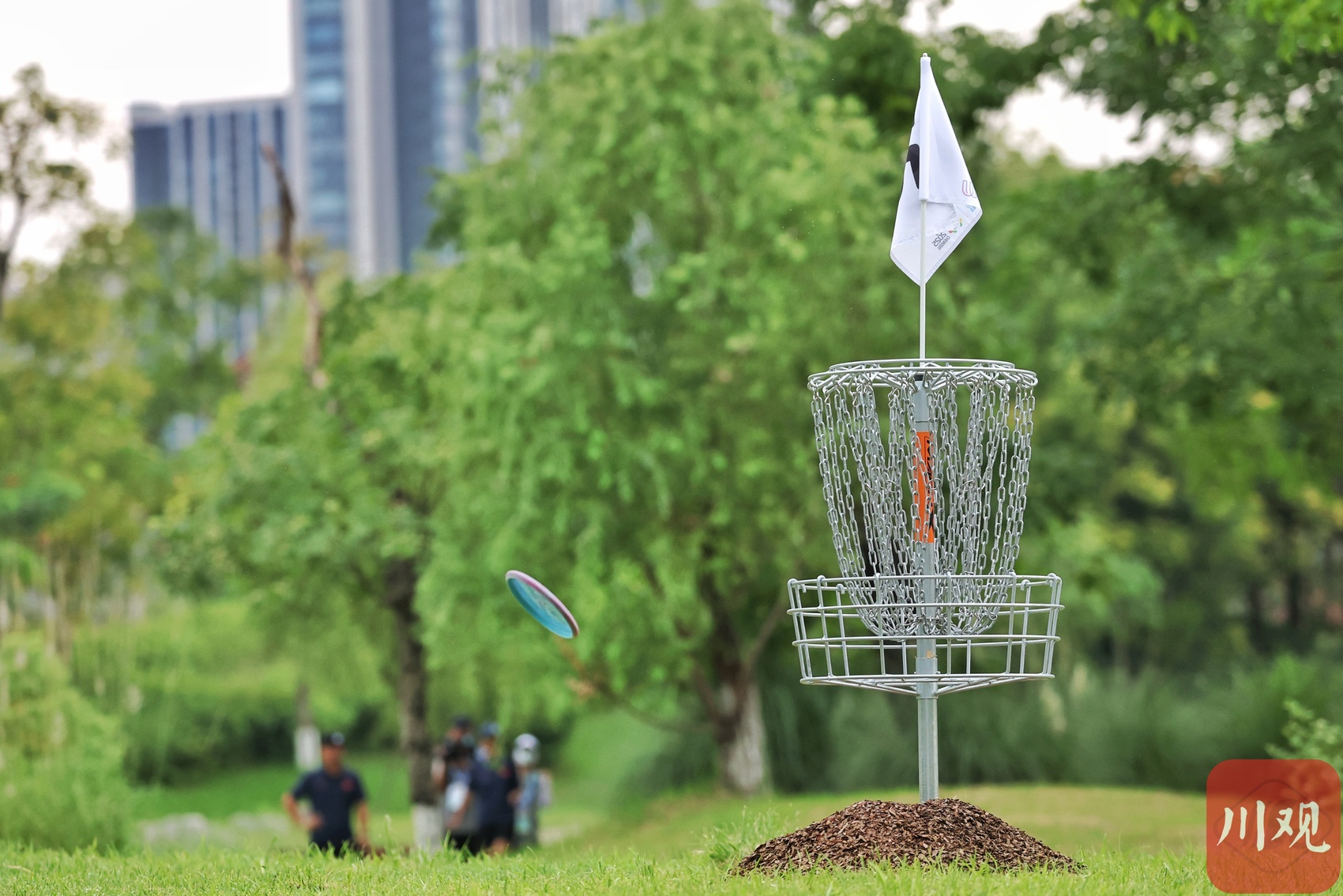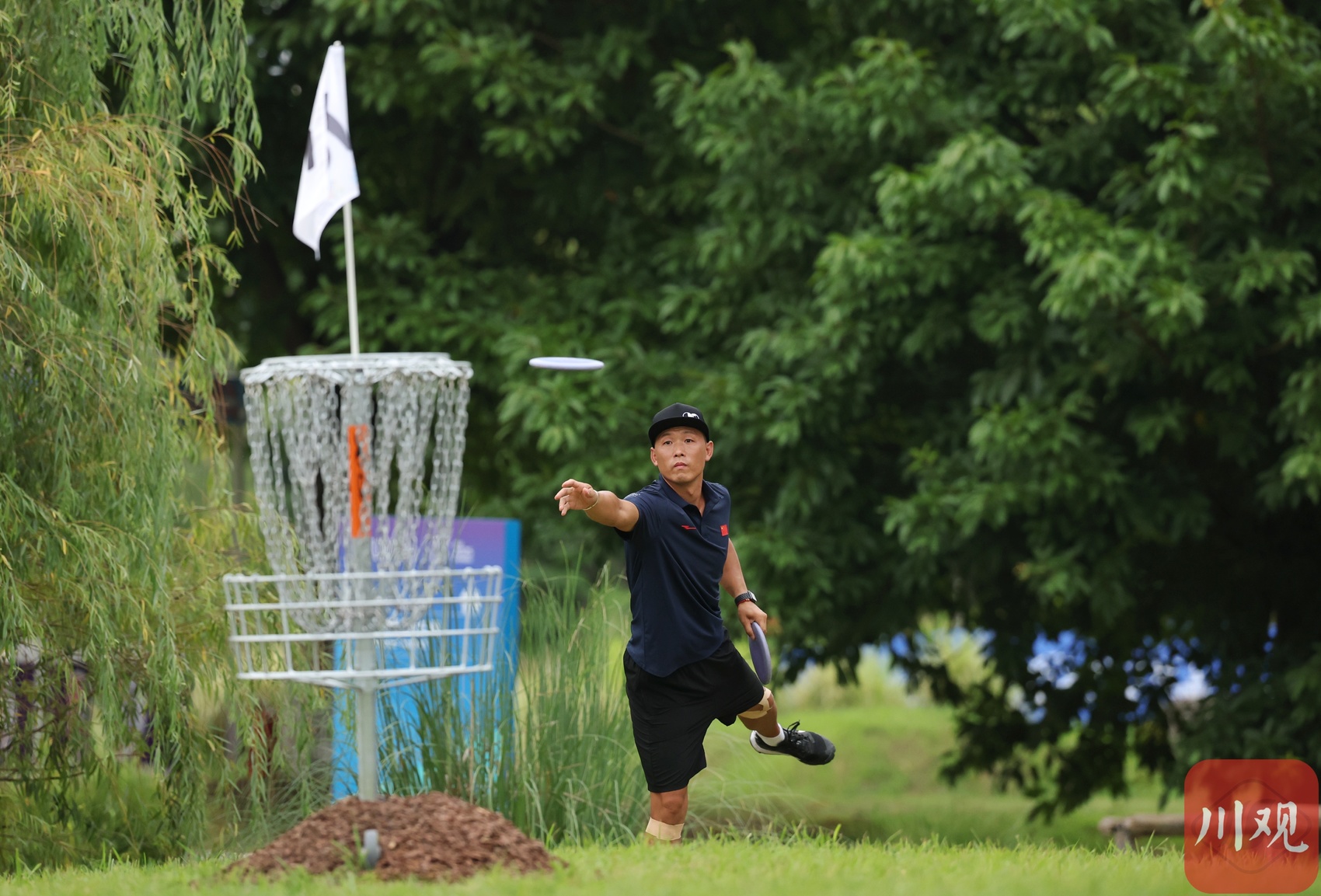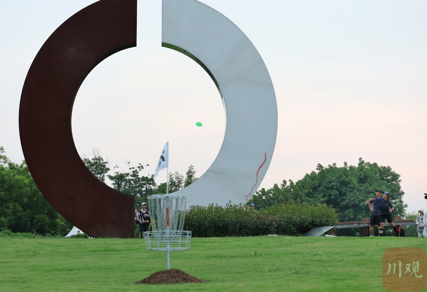 中国队员马彦文抛掷的飞盘绕过“天府之眼”。
