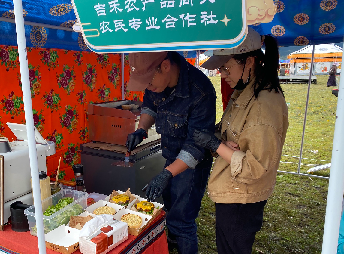 工作人员正在制作酥油牛肉汉堡