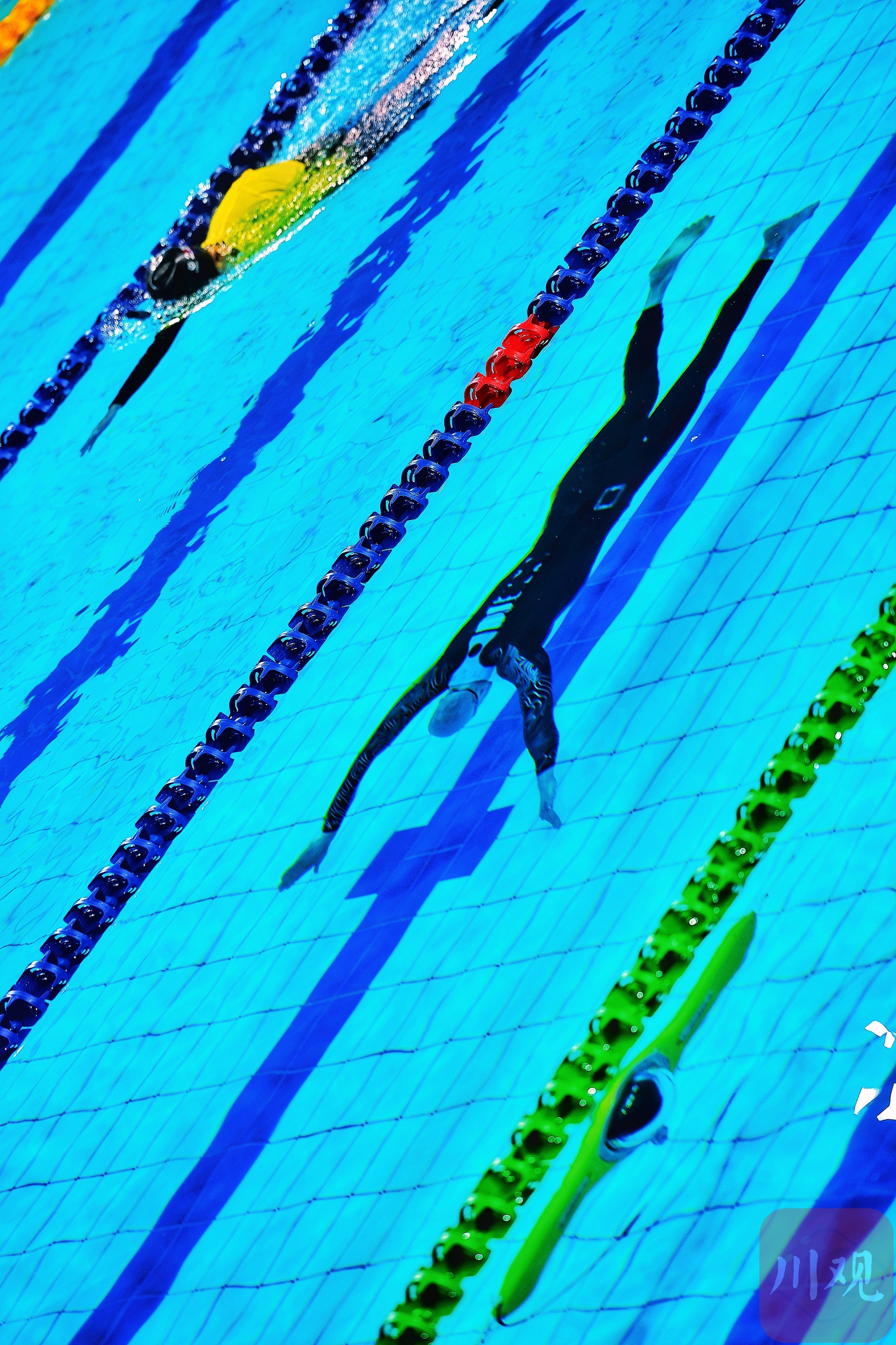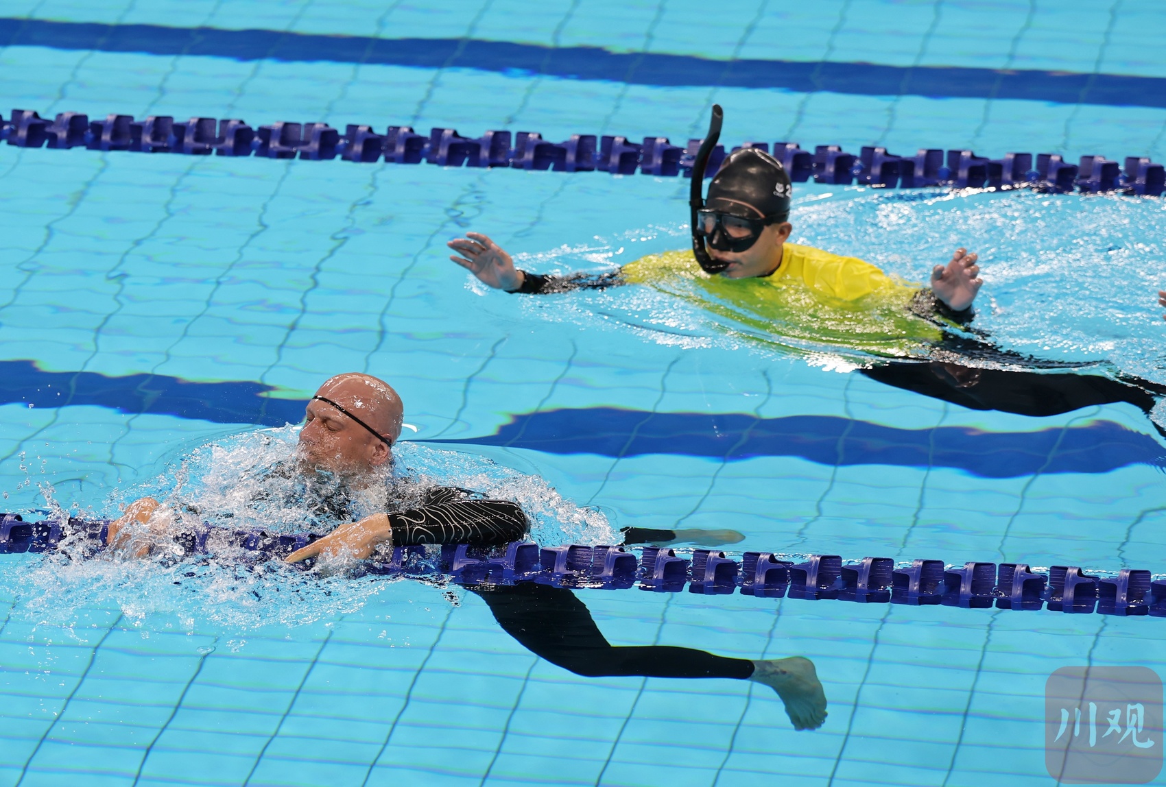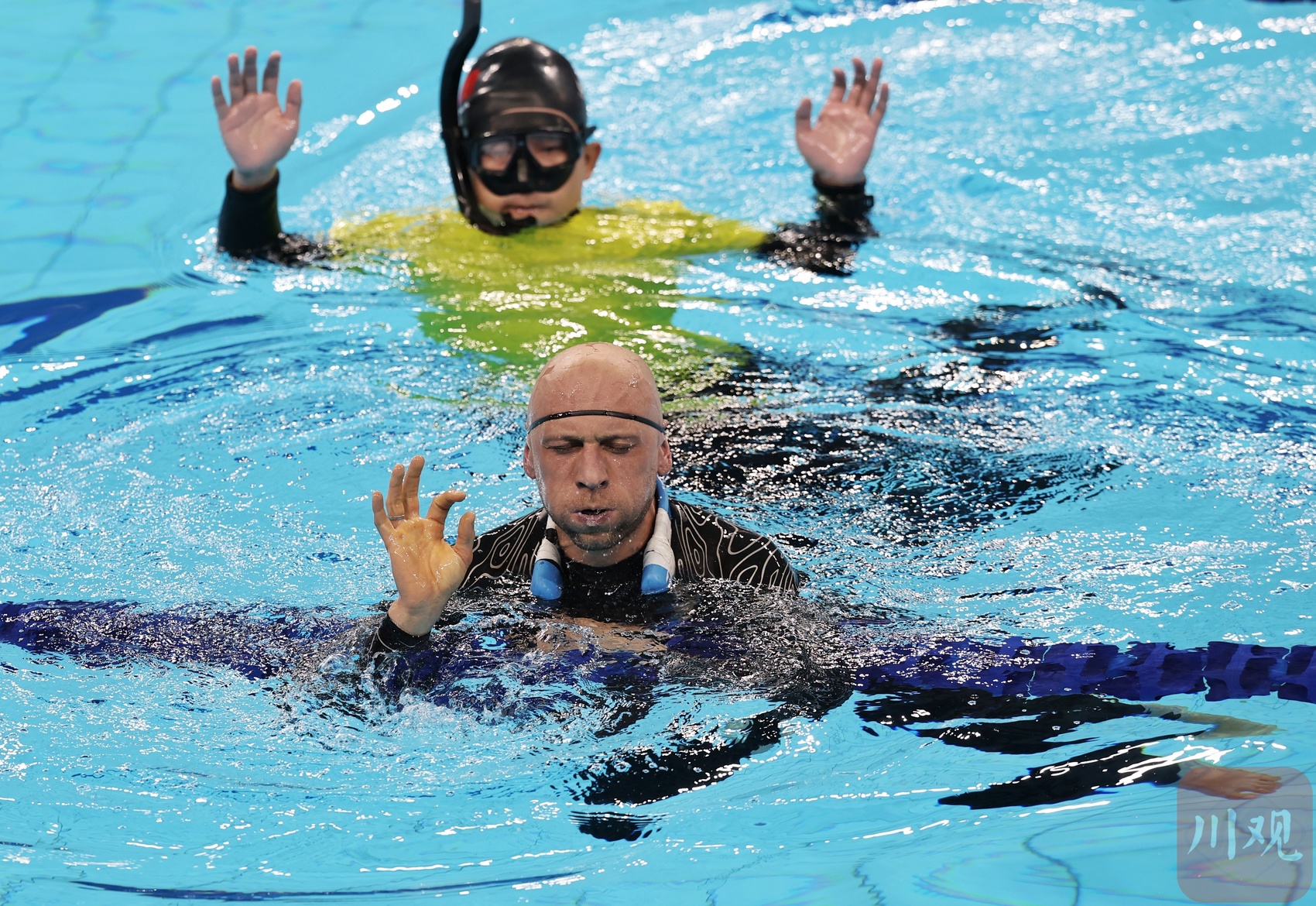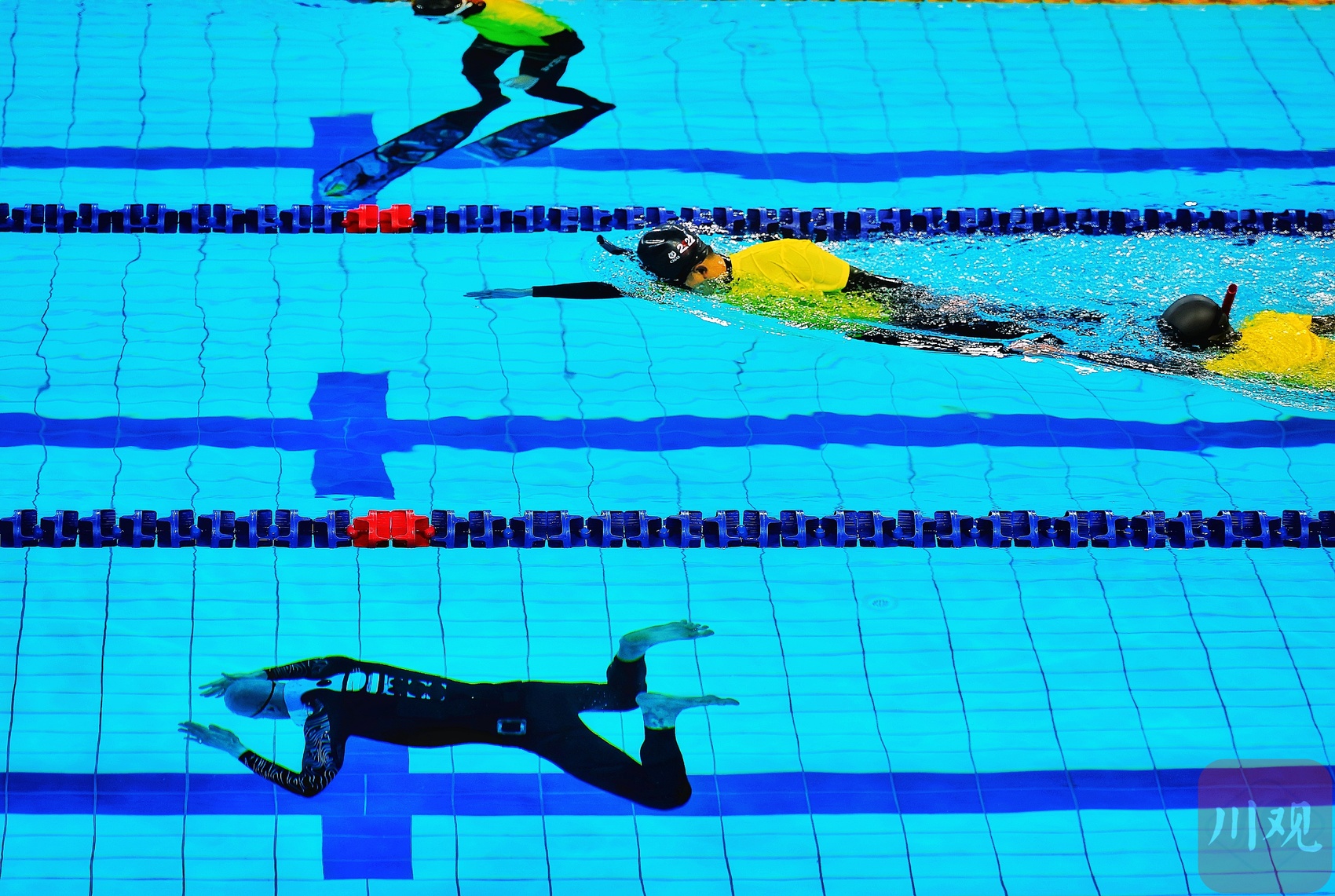 8月10日上午,成都世运会自由潜水女子动态无蹼、男子动态无蹼决赛在成都体育学院三岔湖校区游泳馆开赛,中国选手唐珂(女)、金明(男)在比赛中亮相。