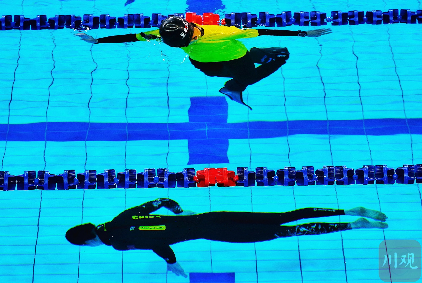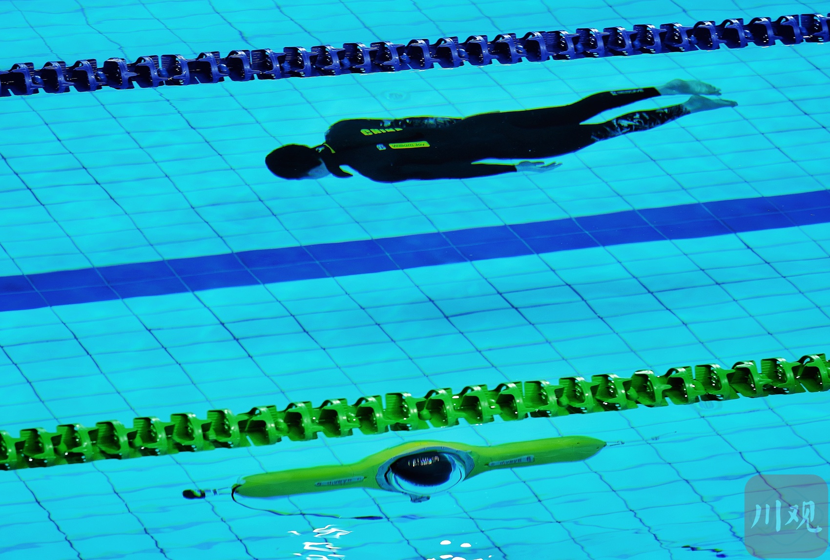 中国选手金明在比赛中,水底伴行的是水下摄影机。