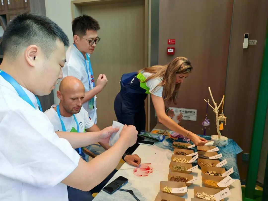 成都东部新区在世运村A区设置中医药体验中心,围绕“传统智慧·健康世运”主题,系统构建三大体验模块。中医药文化体验区通过中英双语展板、药材标本及数字影像,生动呈现天回医简、中药炮制、蜀地本草、针灸铜人及经络学说等核心智慧,吸引参与者驻足学习。互动实践区的香囊手工制作提供10余味草本配方,艾草锤工坊结合捶打教学与温通原理进行演示。中医与运动康复体验区则运用“体质九分法”为运动员等提供个性化养生方案,并通过推拿、真气拔罐有效纾解赛时疲劳,同时结合运动康复指导、手法治疗及DMS(深层肌肉刺激治疗)体验,为健儿舒缓疲劳,展现了传统技法与现代康复融合的优势。