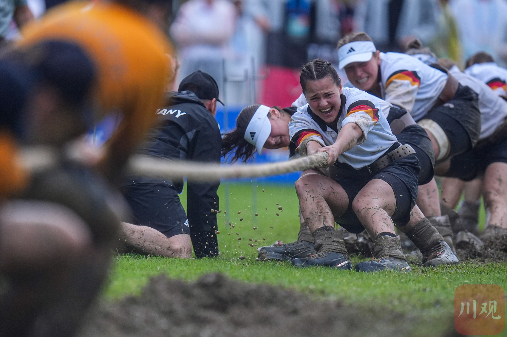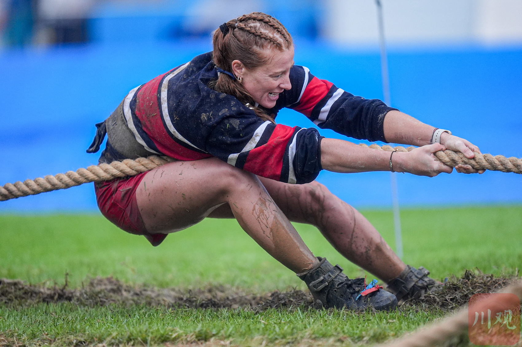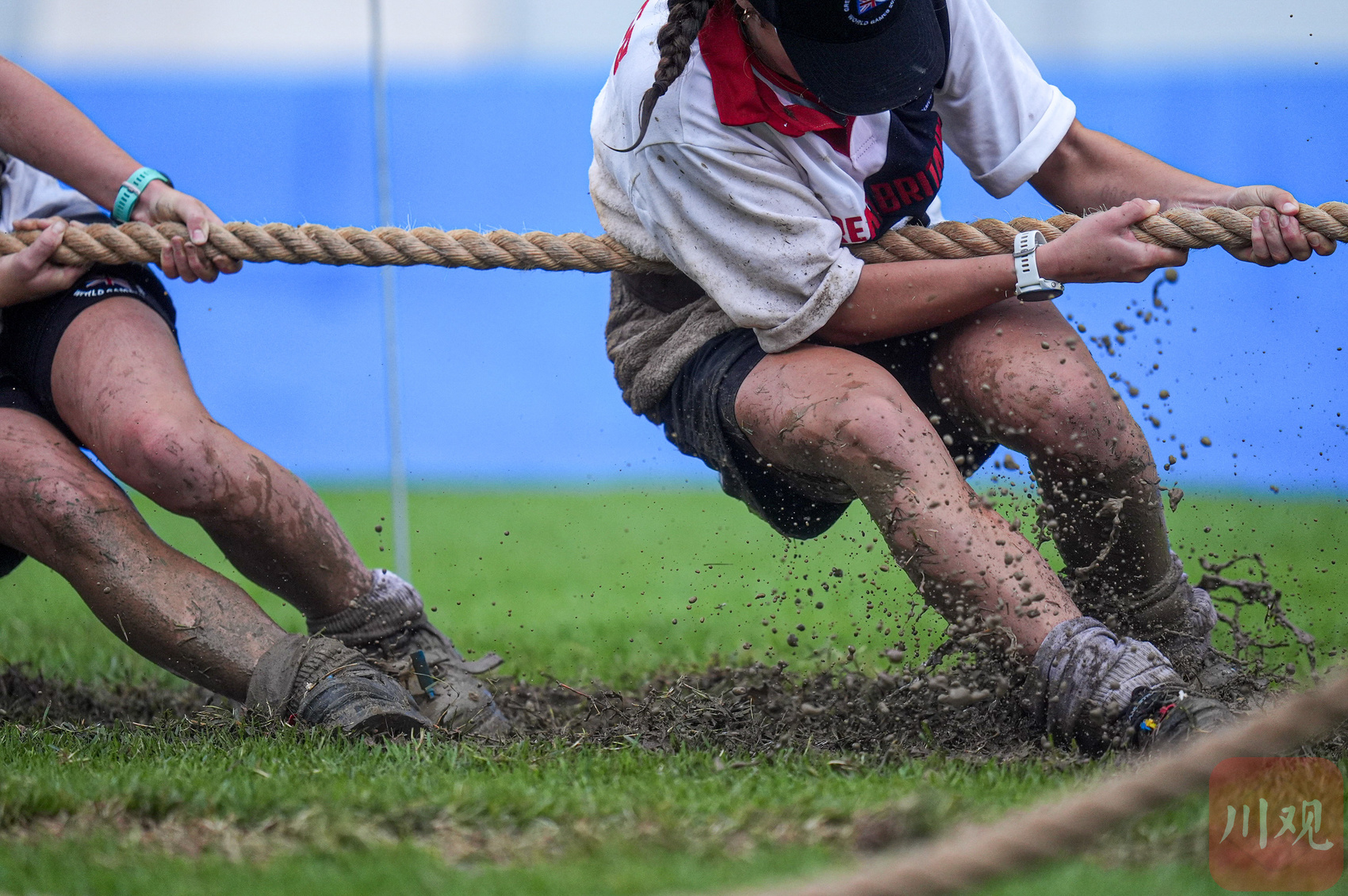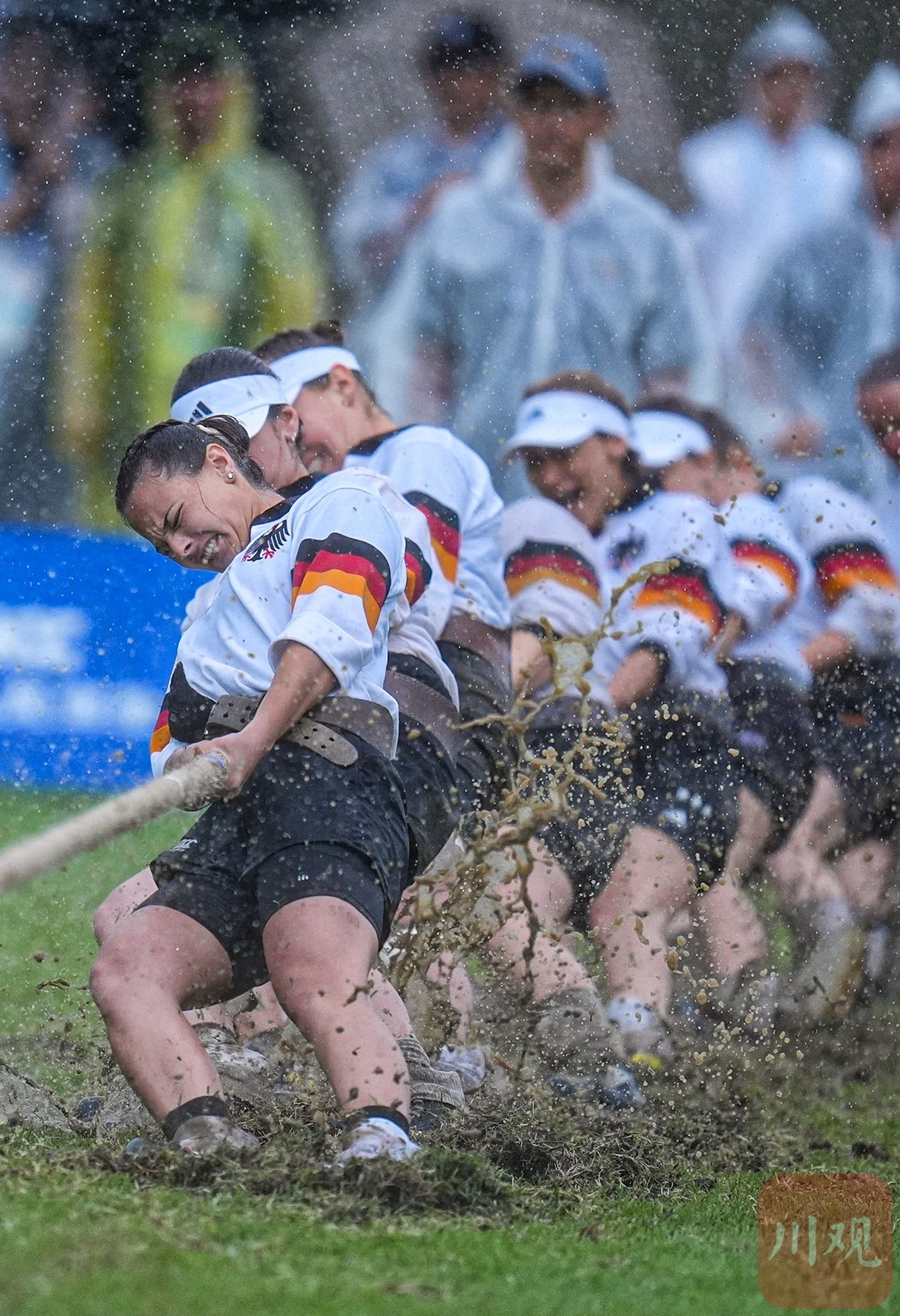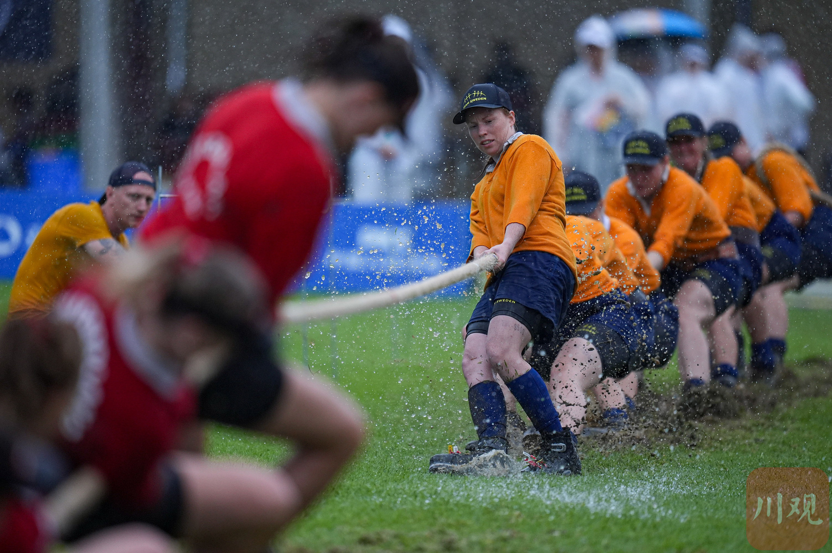 世运会女子拔河比赛,风雨无阻战犹酣。