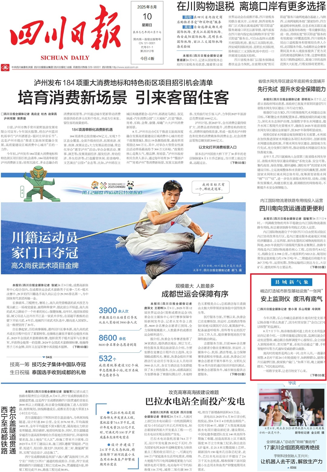 8月10日晚,“龍霏传奇·拳峰勇士之路”格斗赛在峨眉山脚下开启。中国首位MMA世界金腰带王者王赛与中国格斗年轻代表马嘉文上演力量与技巧对决。以成都世运会为契机,全省各地各类赛事紧锣密鼓,融合本地特色文化和资源,掀起“跟着赛事去旅行”热潮。