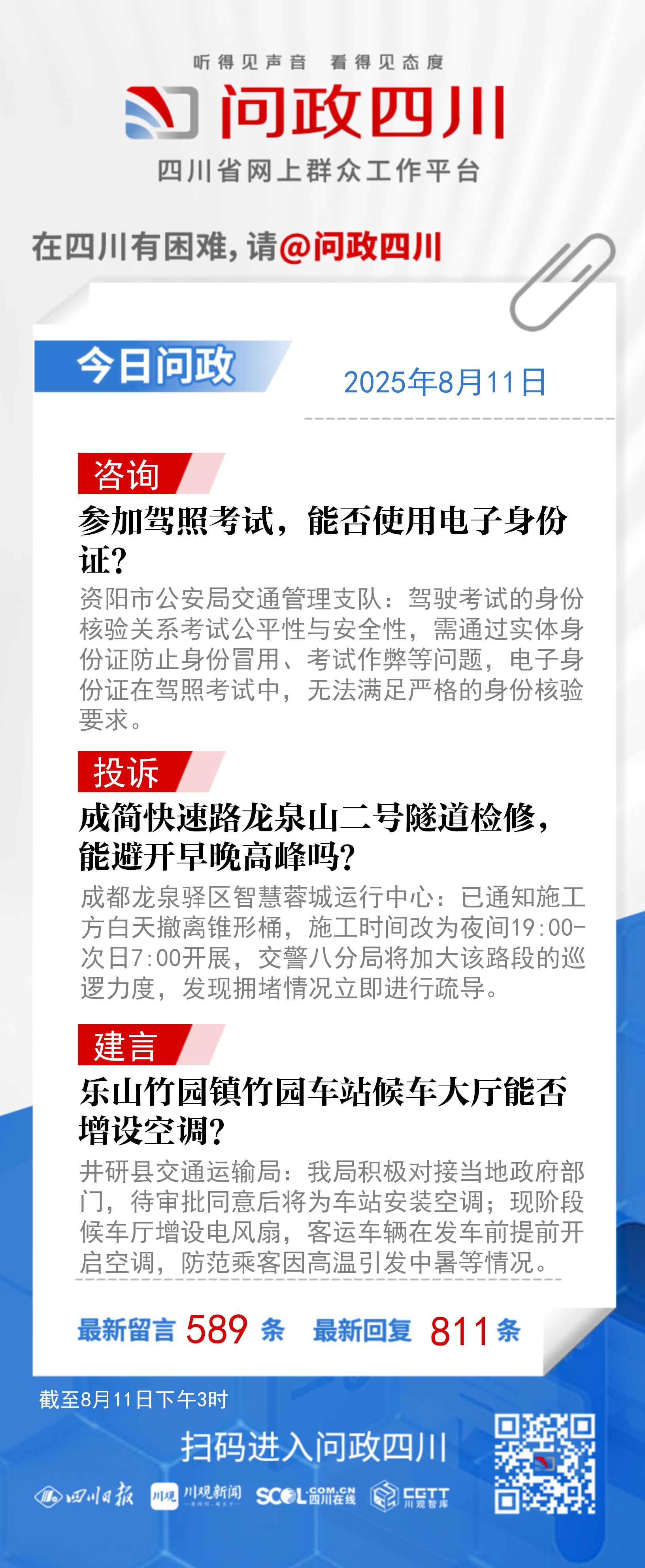 在四川有困难,找问政四川。如果您在四川遇到了操心事、烦心事、揪心事,请登录“四川省网上群众工作平台—问政四川”或拨打问政四川热线(028-96001)留言反映、求助或建议。我们将充分发挥平台的互动联系作用及舆论监督功能,第一时间传递民声,推动问题得以及时解决——听得见声音,看得见态度。