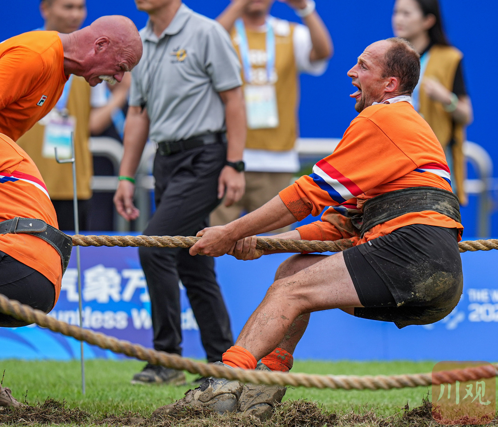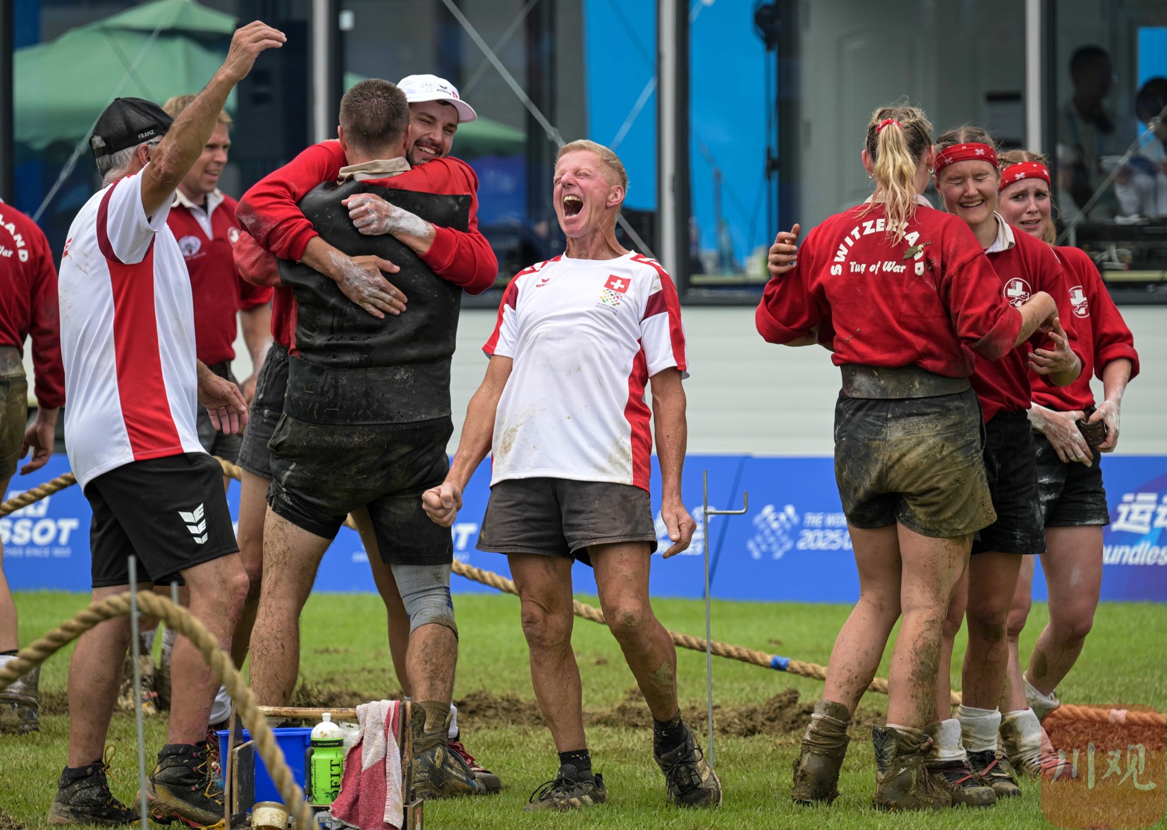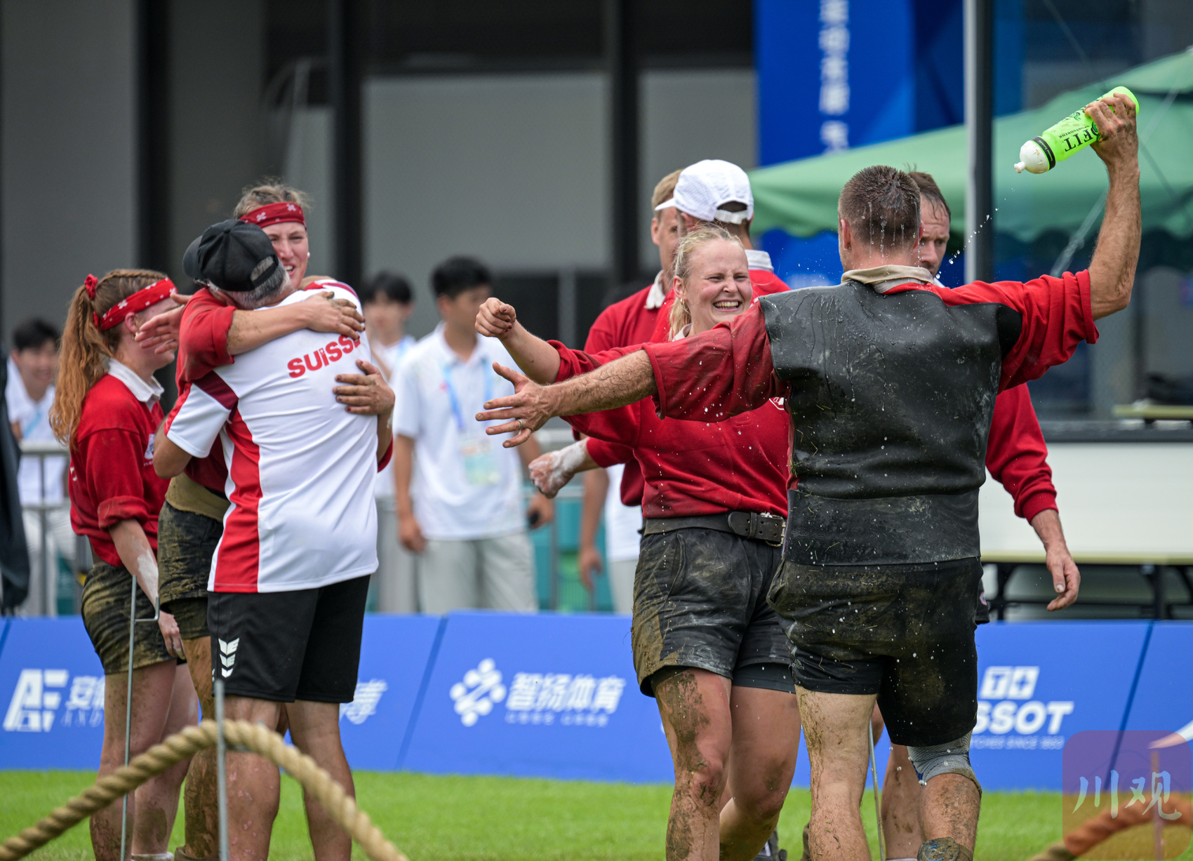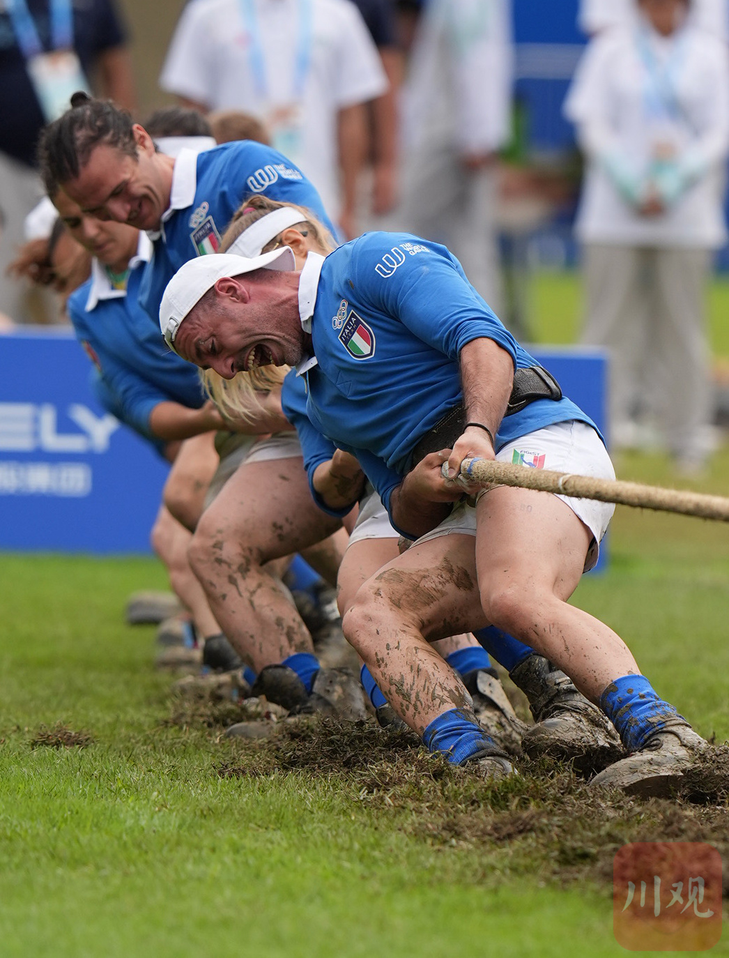 8月11日,东安湖体育公园中央广场,成都世运会混合室外拔河580公斤级比赛中,瑞士队经过多轮比拼,最后战胜比利时队获得冠军。