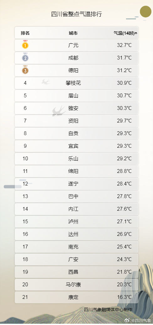 8月11日14时四川各城市实况气温