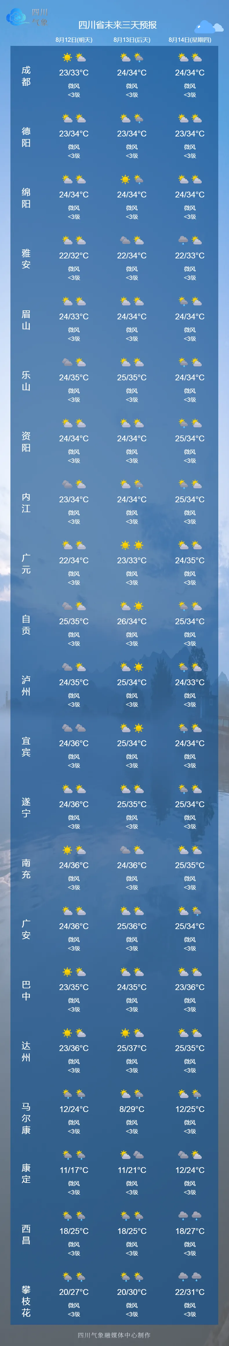四川省气象台预计,未来三天,盆地大部多云,有分散雷雨或阵雨;川西高原和攀西地区多雷雨或阵雨,雨水主要集中在甘孜州中部南部、阿坝州南部和攀西地区西部南部。