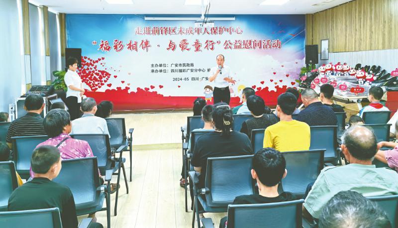 四川福彩广安分中心组织代销者前往前锋区未成年人保护中心开展公益慰问活动。