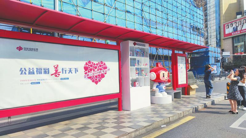 四川福彩在公交站台开展福利彩票公益宣传。