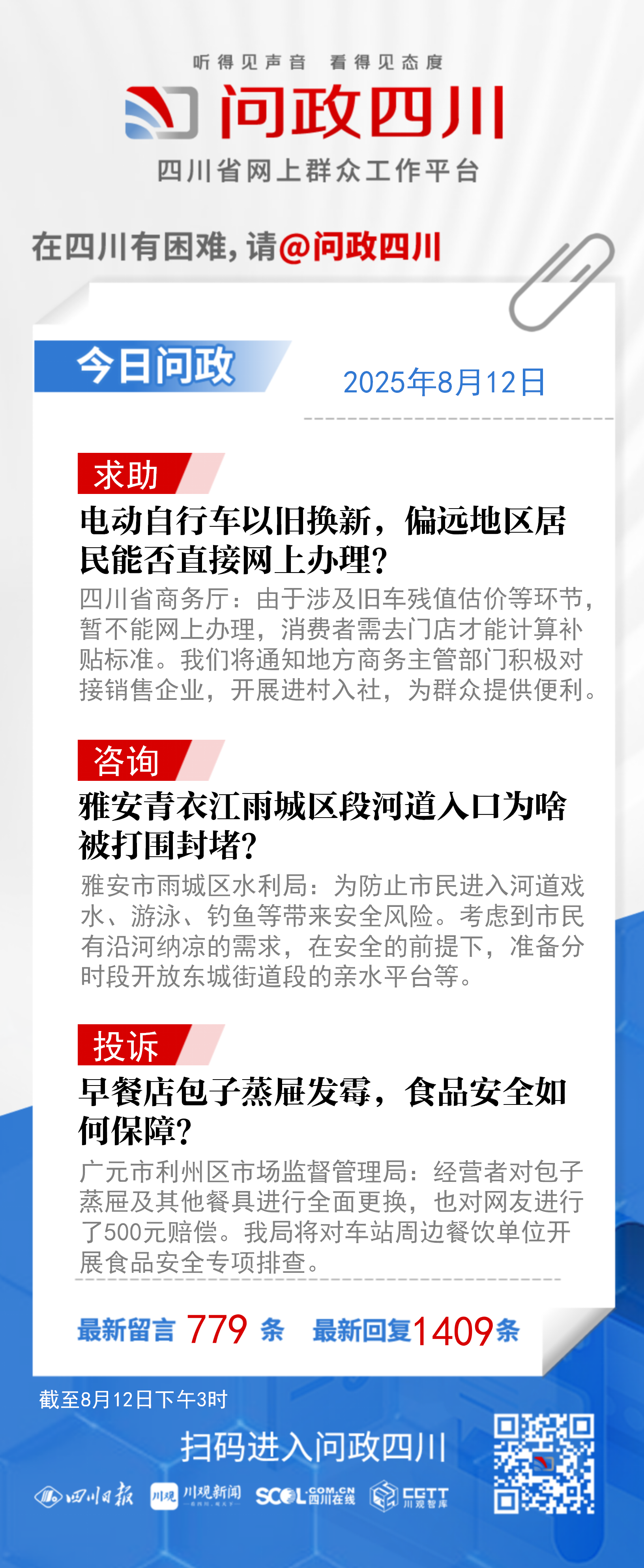 在四川有困难,找问政四川。如果您在四川遇到了操心事、烦心事、揪心事,请登录“四川省网上群众工作平台—问政四川”或拨打问政四川热线(028-96001)留言反映、求助或建议。我们将充分发挥平台的互动联系作用及舆论监督功能,第一时间传递民声,推动问题得以及时解决——听得见声音,看得见态度。