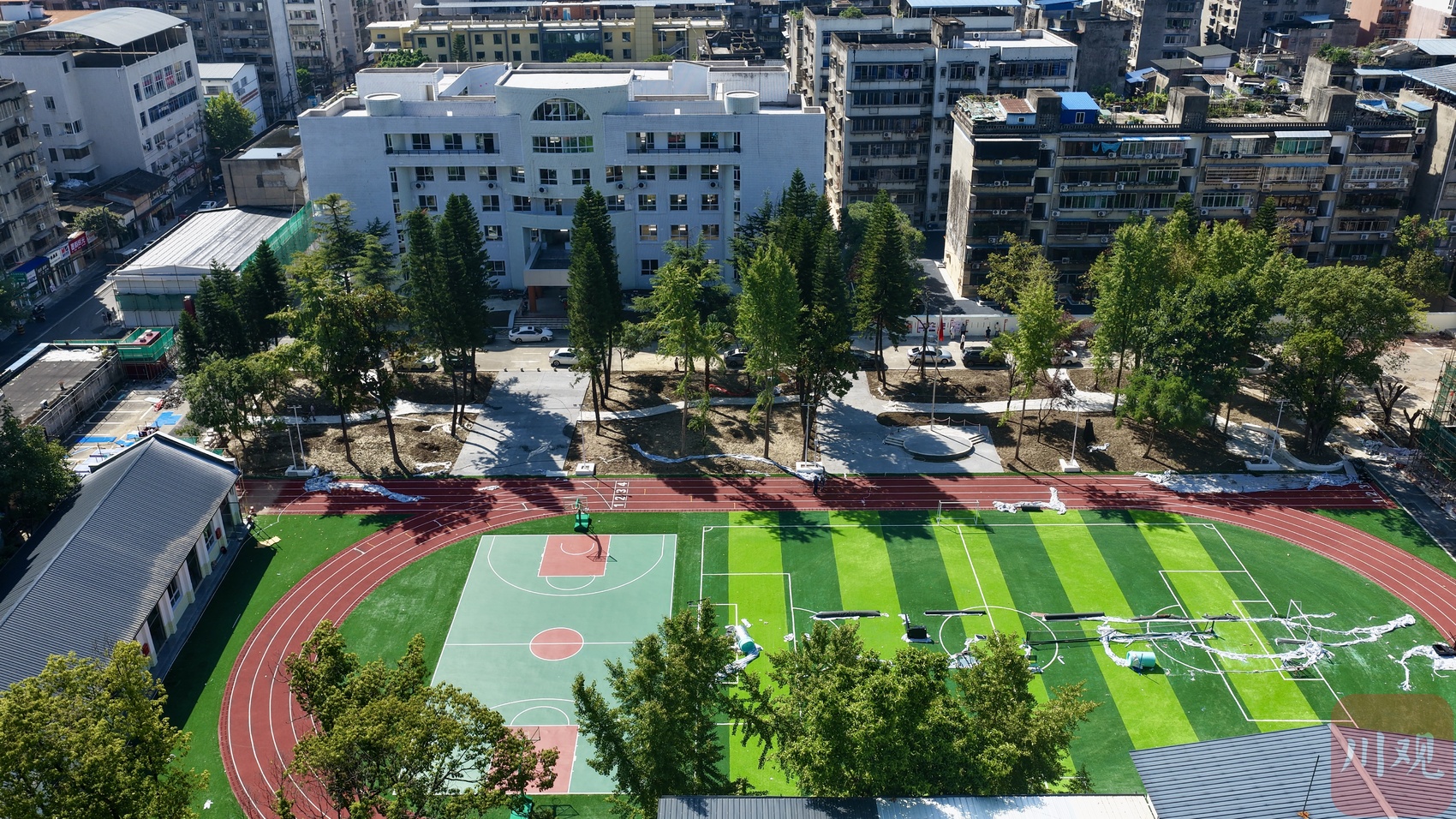 遂宁市高升实验小学校二校区在原遂宁市委党校校址基础上进行改造,改造工程总投资2400万元,重点围绕教学空间、运动设施和后勤保障三大核心进行升级,涵盖24间教室及20间功能室。新建了5000平方米的运动场,包含环形跑道、足球场和篮球场。食堂按照最高3500人次的备餐标准进行了改造,能集中容纳1200名学生轮次就餐。