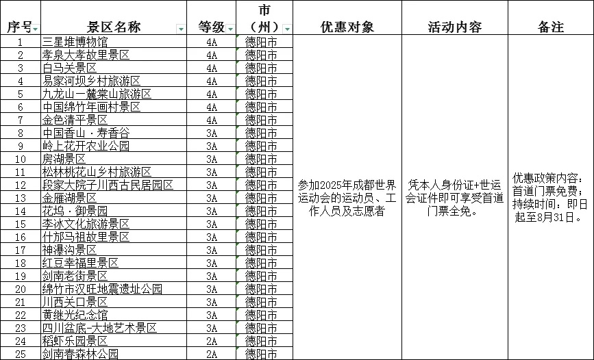 8月12日,川观新闻从德阳市文旅局获悉,为迎接2025年第12届世界运动会(以下简称“世运会”),展示德阳旅游形象,全市A级旅游景区联合推出重磅优惠政策:即日起至8月31日,世运会运动员、工作人员及志愿者可凭本人身份证和世运会证件,享受景区首道门票免费优惠。