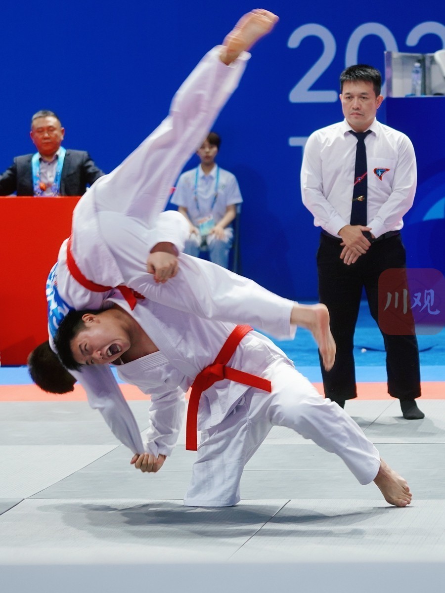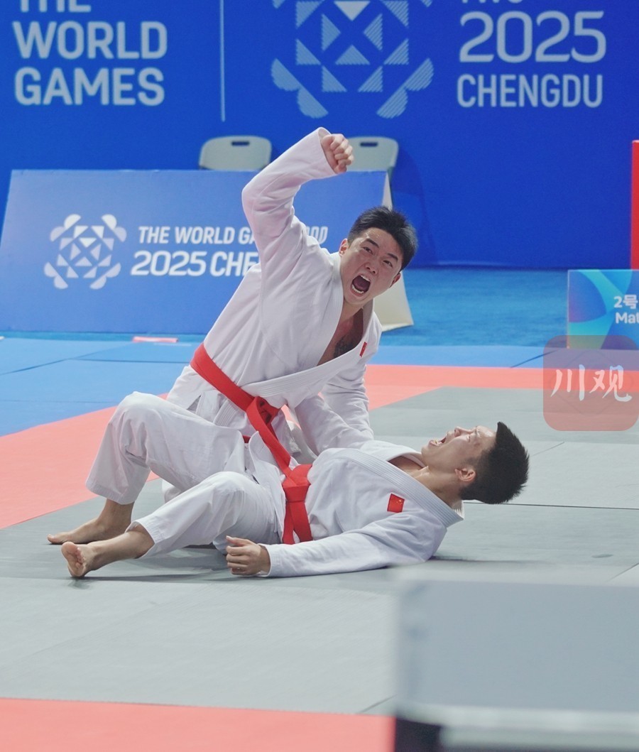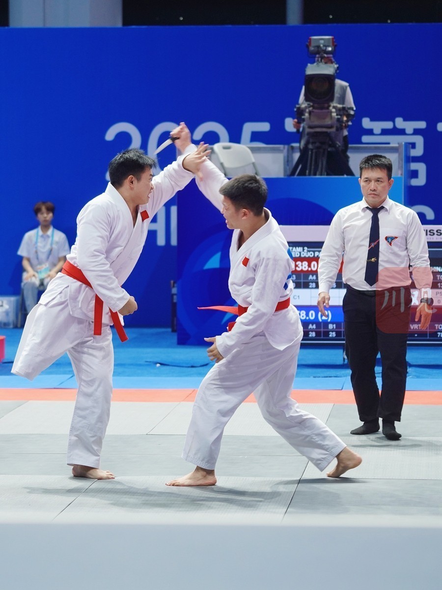 8月12日,在简阳文体中心体育馆,2025年成都世界运动会的残疾人柔术项目举行决赛。来自中国体育代表团的四川籍运动员李雨财、郭奥,在家门口主场作战,以167∶162的比分战胜对手,拿下了肢体残疾混合双人柔术项目金牌。