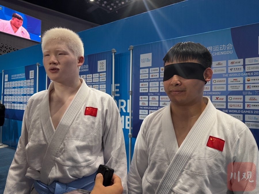 8月12日,在简阳文体中心体育馆,2025年成都世界运动会的残疾人柔术项目举行决赛。来自中国体育代表团的四川籍运动员王文强、潘天佑,获得了视力残疾混合双人柔术项目银牌。
