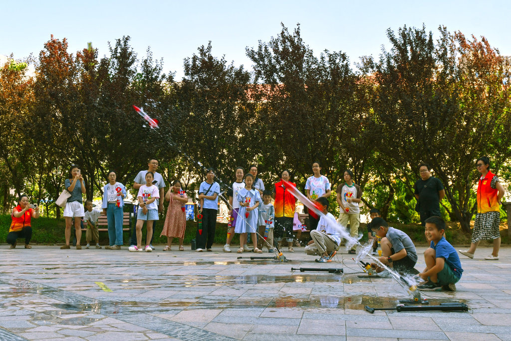 8月12日,小朋友在山东省烟台市福山区银河明珠社区暑期科普公益课堂上发射自制的“水火箭”。