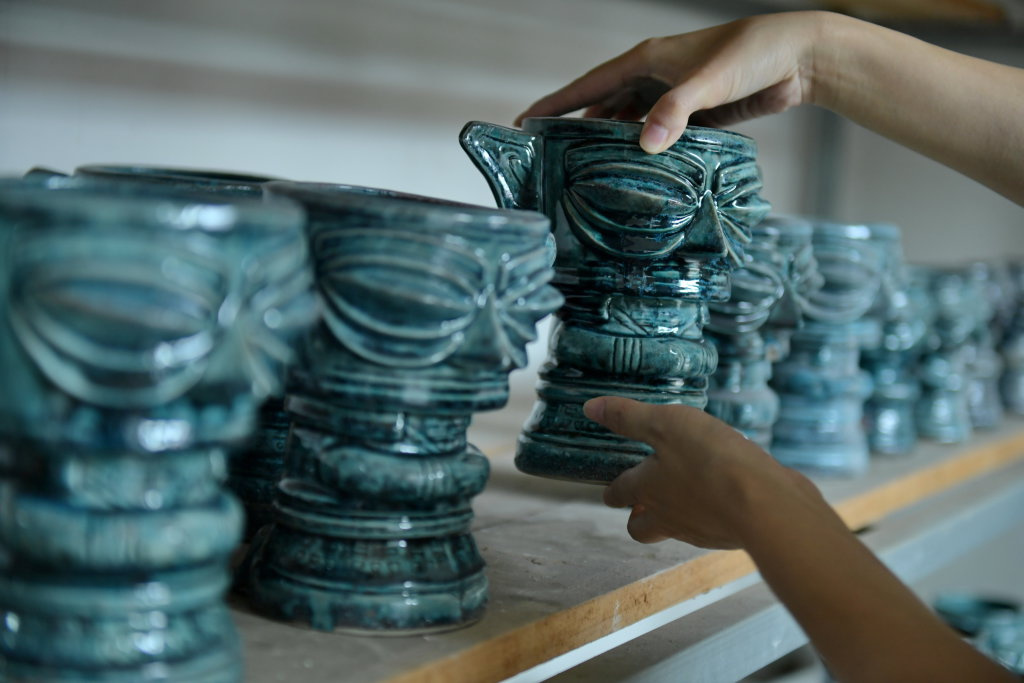 8月11日,在四川省彭州市致和街道明台村肖勇工作室,工作人员摆放烧制好的具有三星堆元素特色瓷器。