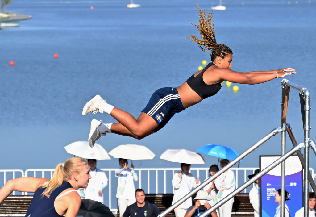 8月12日,瑞典选手米兰达(后)在比赛中。最终,她获得冠军。