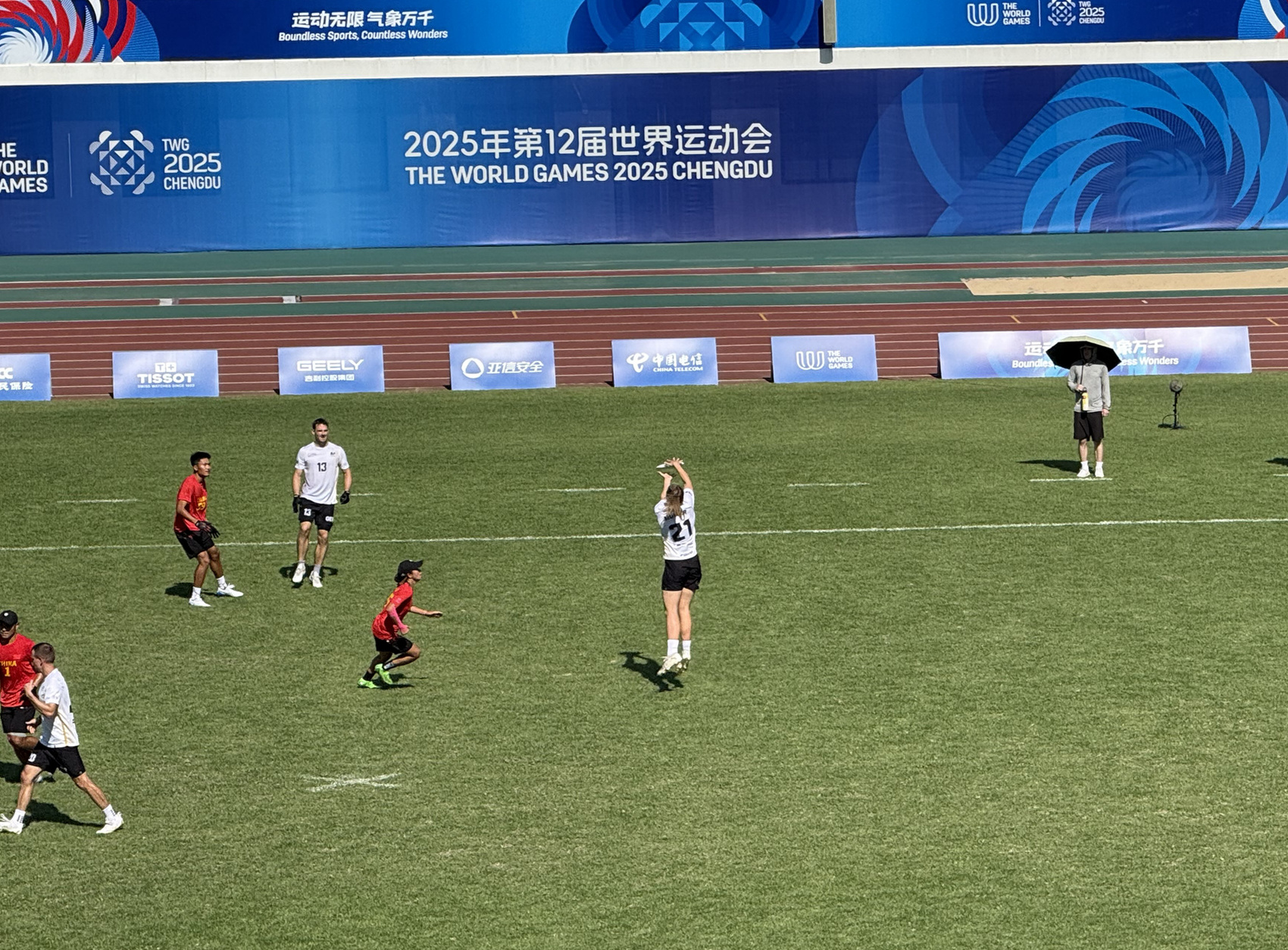 8月12日下午,成都世运会团体飞盘项目赛场上,中国队完成了首秀。这支主要由成都大学、北京体育大学等高校学生和地方俱乐部选手组成的队伍,虽然最终以8比13不敌德国队,但仍然表现出了良好的竞技状态和技战术水平,给德国队制造了不少压力。