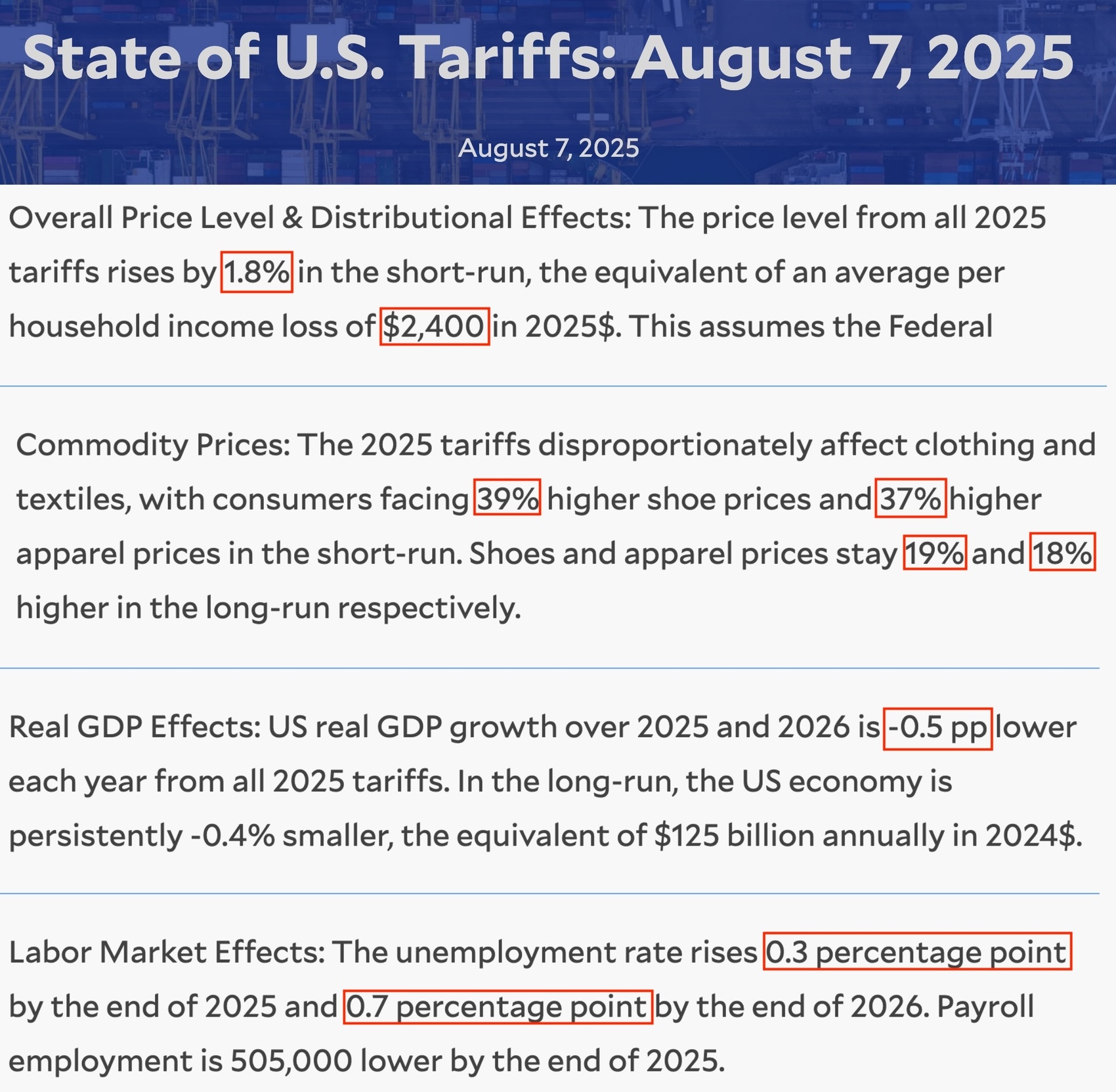 另外,关税政策将导致美国失业率到今年年底上升0.3个百分点,到明年年底上升0.7个百分点。