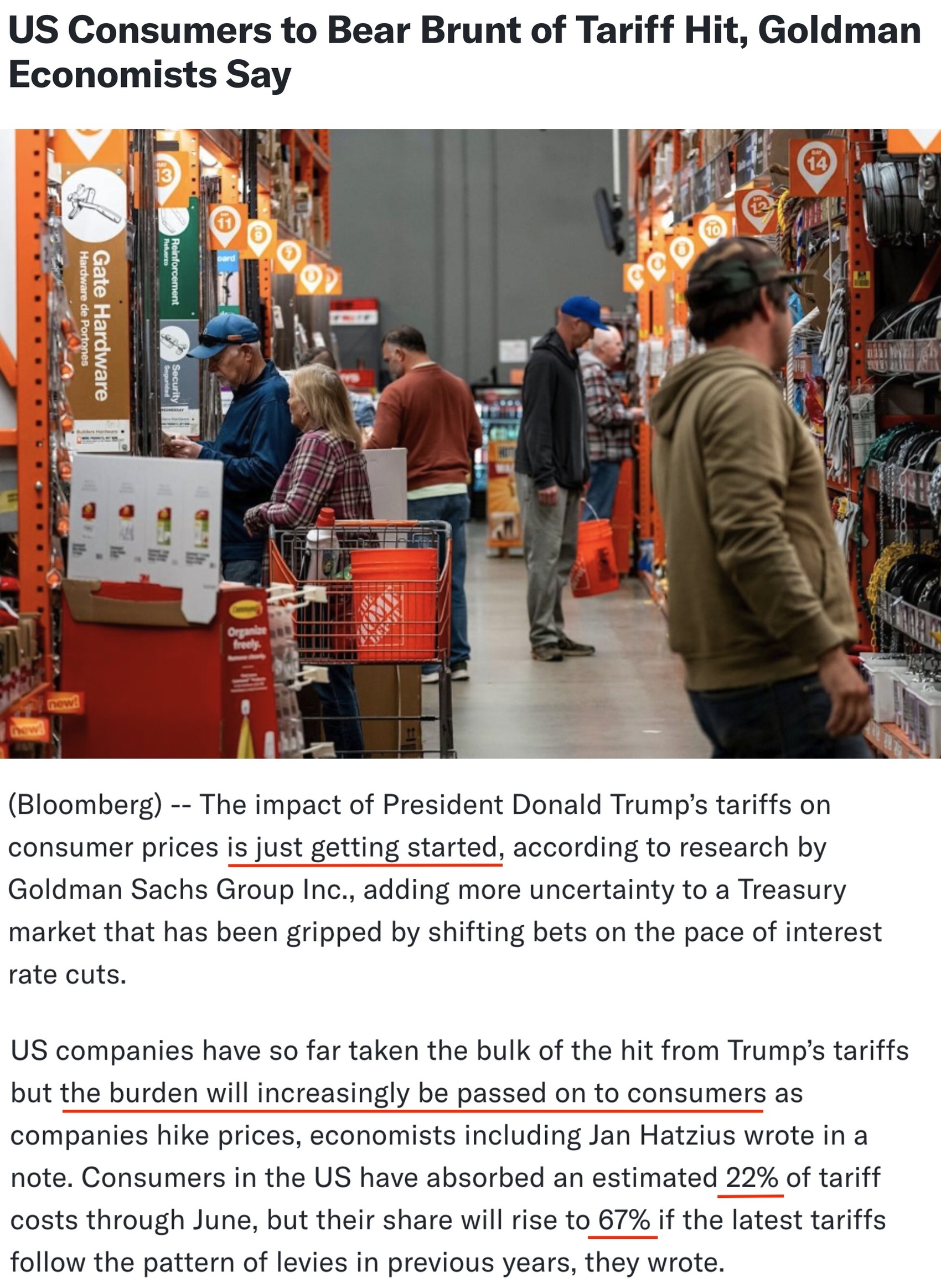 报告显示,截至6月底,美国消费者已经消化了大约22%的关税成本;如果关税政策延续,这一数字未来可能会大幅上升到67%。