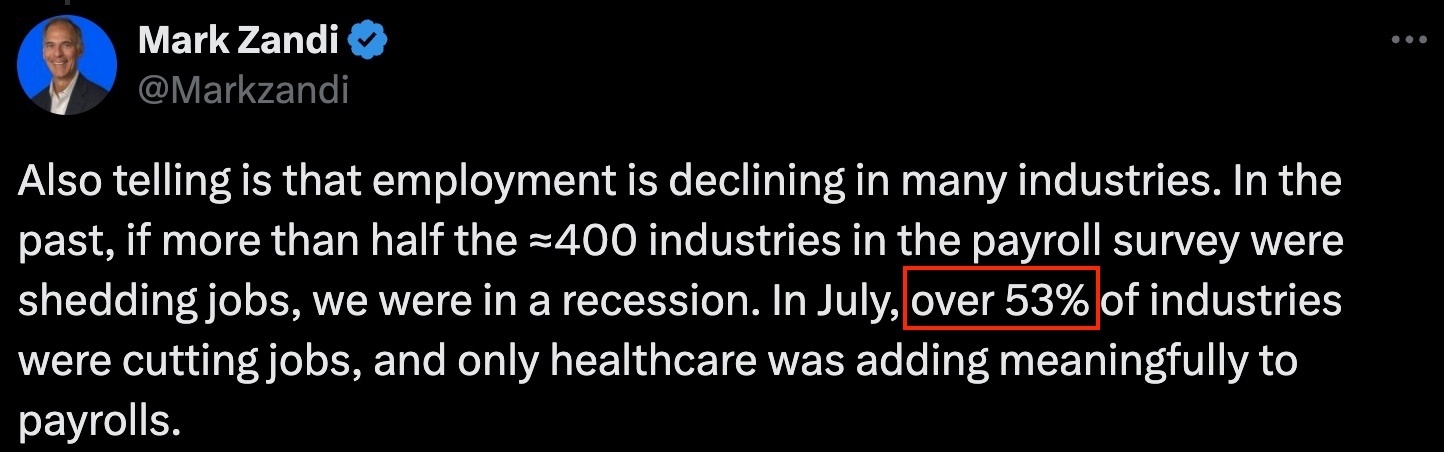 美国穆迪分析公司首席经济学家马克·赞迪日前在社交媒体上发文警告,受关税导致的成本增加影响,美国超过半数行业已从7月开始裁员。