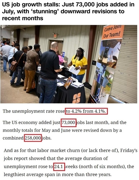 7月美国失业率从前一月的4.1%升至4.2%。当月非农业部门新增就业人数仅为7.3万,远低于市场预期的11.5万。5月和6月的新增非农就业数据也被大幅向下修正,总共减少了25.8万个就业岗位。当前美国失业者每人平均失业24.1周,是三年多来最长的平均失业时间。