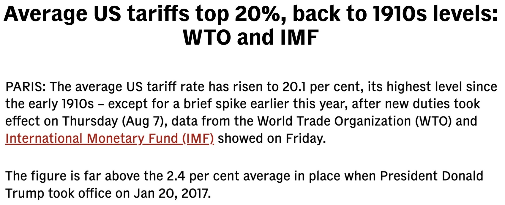 世界贸易组织(WTO)和国际货币基金组织(IMF)8日公布的数据显示,随着新关税的实施,美国对全球所有产品的贸易加权平均关税税率已达20.1%,大幅高于年初本届美国政府上台前的2.4%,为110多年来的最高水平。