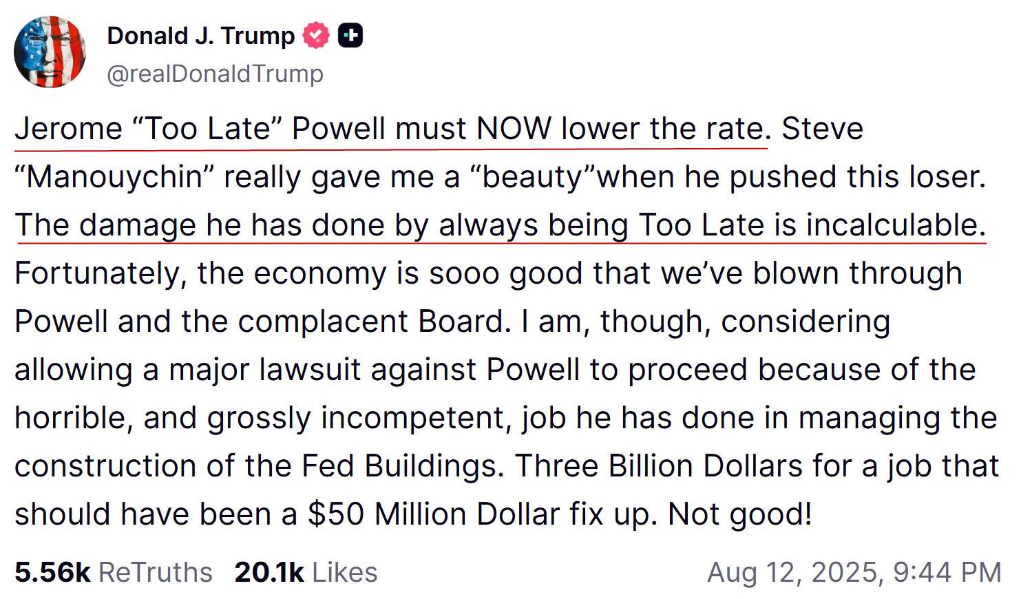 △特朗普12日再次在社交媒体上发文,要求鲍威尔立即降息,并指责其“总是行动太迟”。