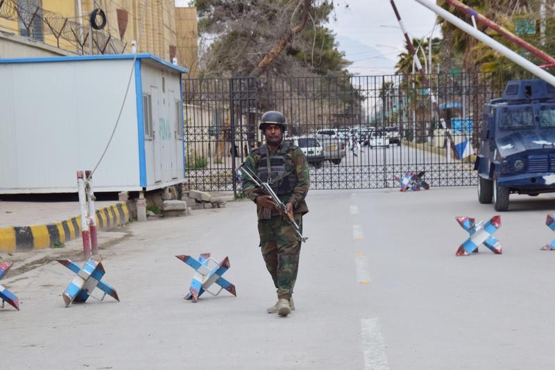 3月12日,在巴基斯坦西南部俾路支省首府奎达,一名安保人员守卫在火车站附近。 新华社发