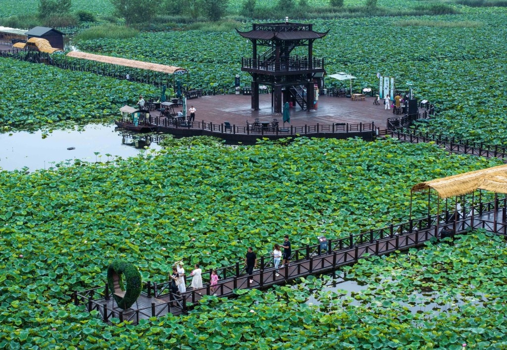 8月13日,游客在江苏省兴化市万亩荷塘景区赏荷游玩(无人机照片)。