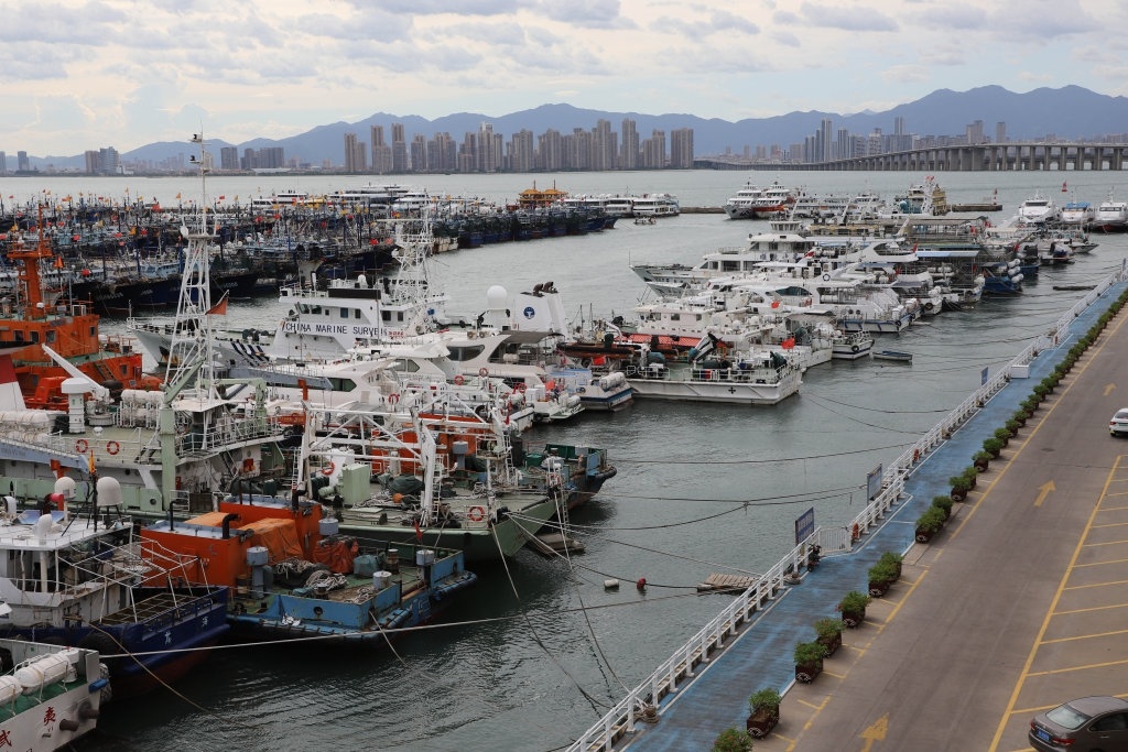 8月13日,各类船只停靠在福建厦门高崎闽台中心渔港躲避台风。