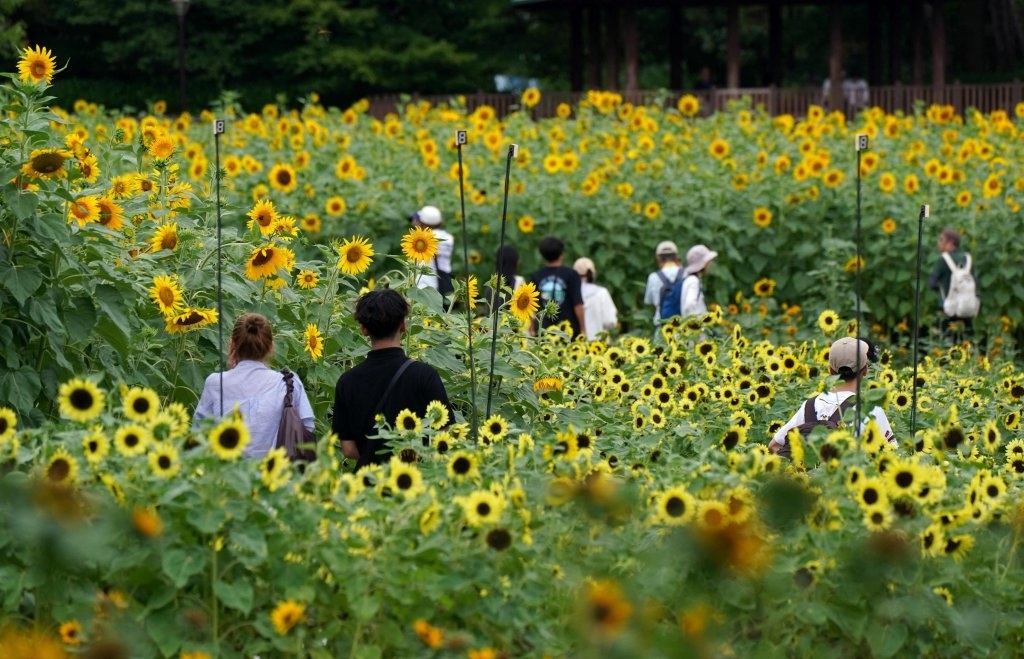 8月13日,在日本东京的一处海滨公园,人们在向日葵花海中参观。