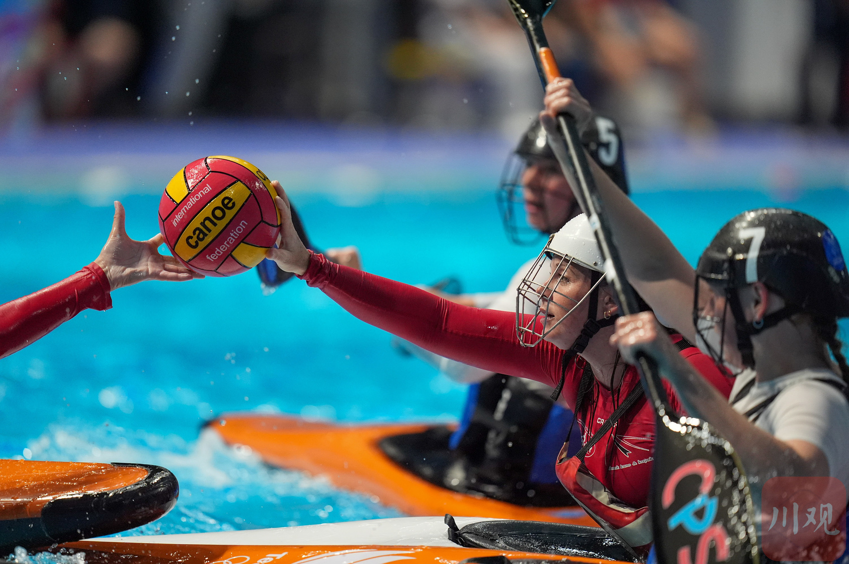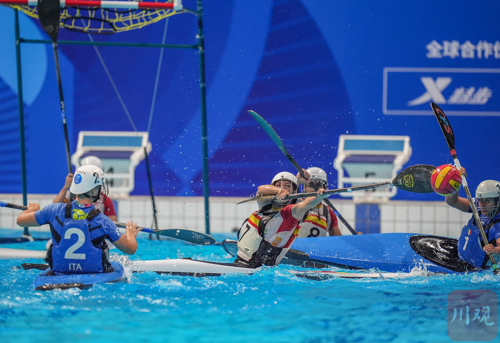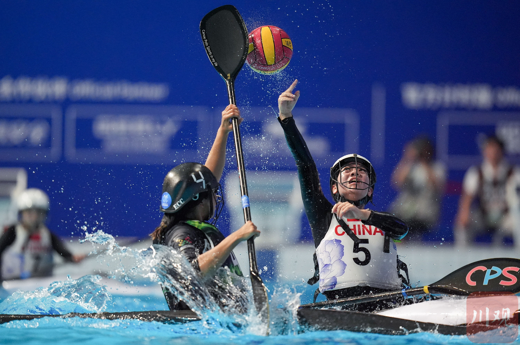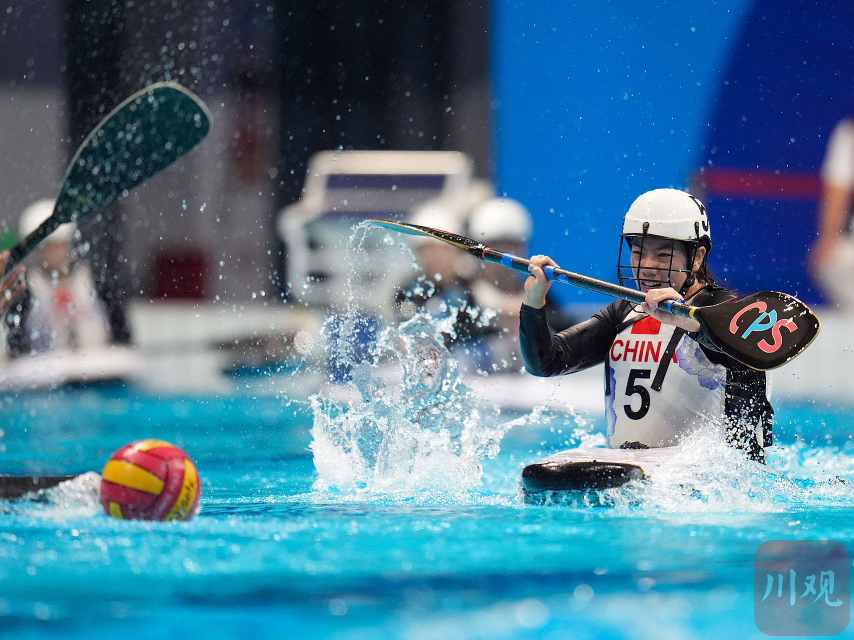 8月13日,简阳文体中心游泳馆,成都世运会皮艇球开赛。来自上海的17岁小姑娘巢语佳为中国队打入世运会皮艇球历史的首枚进球,但遗憾是中国女队1-15负于伊朗队。