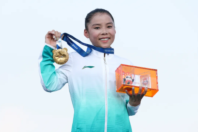 ▷13日,成都世运会跑酷项目女子自由式决赛,前中国女子体操队员商春松发挥出色,以24.7分的成绩获得冠军。