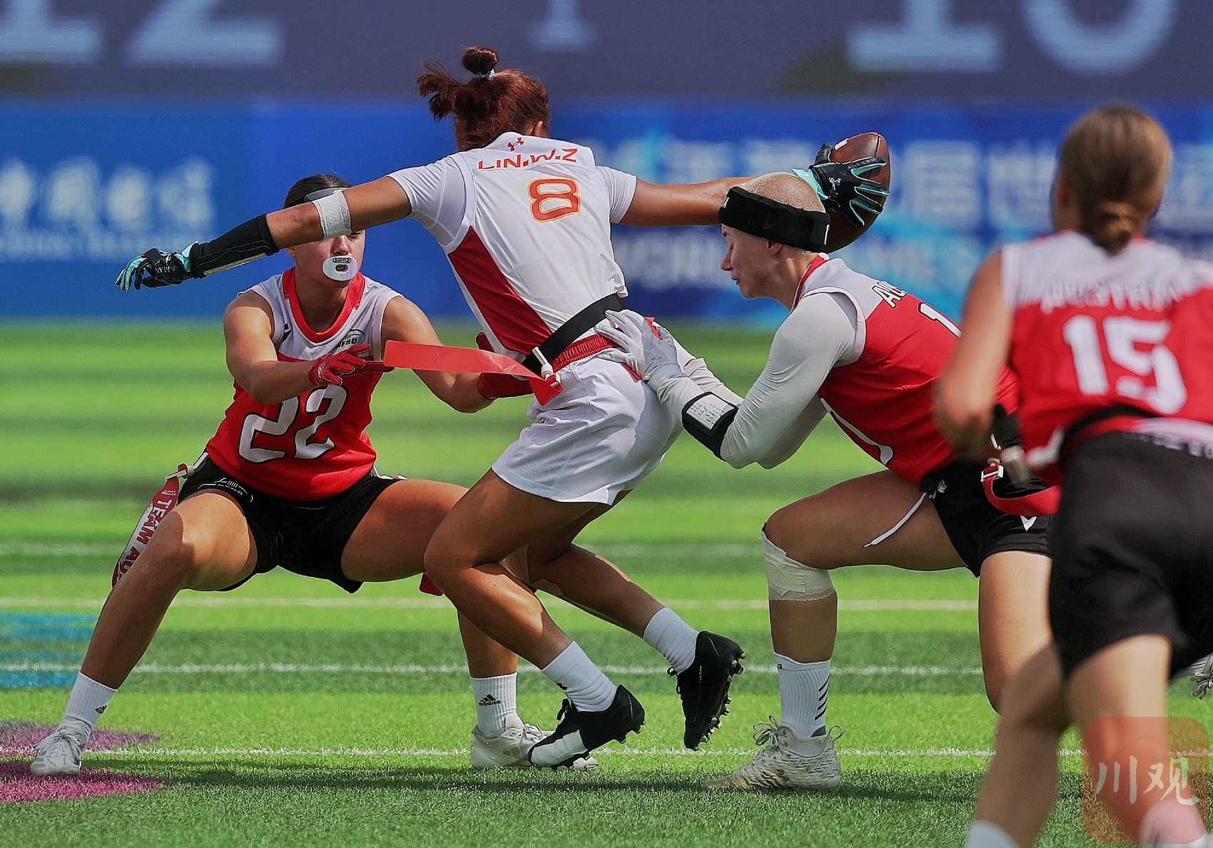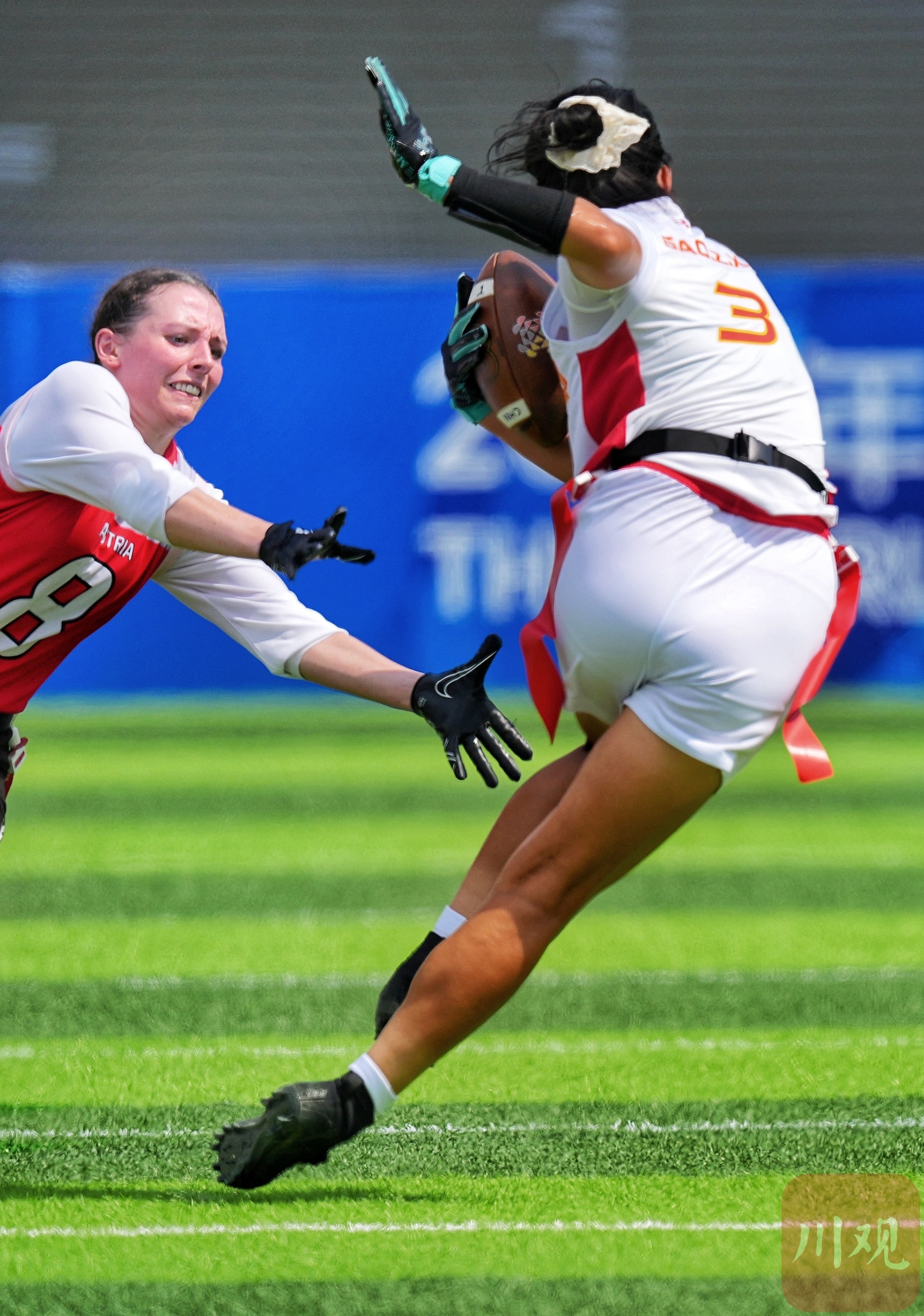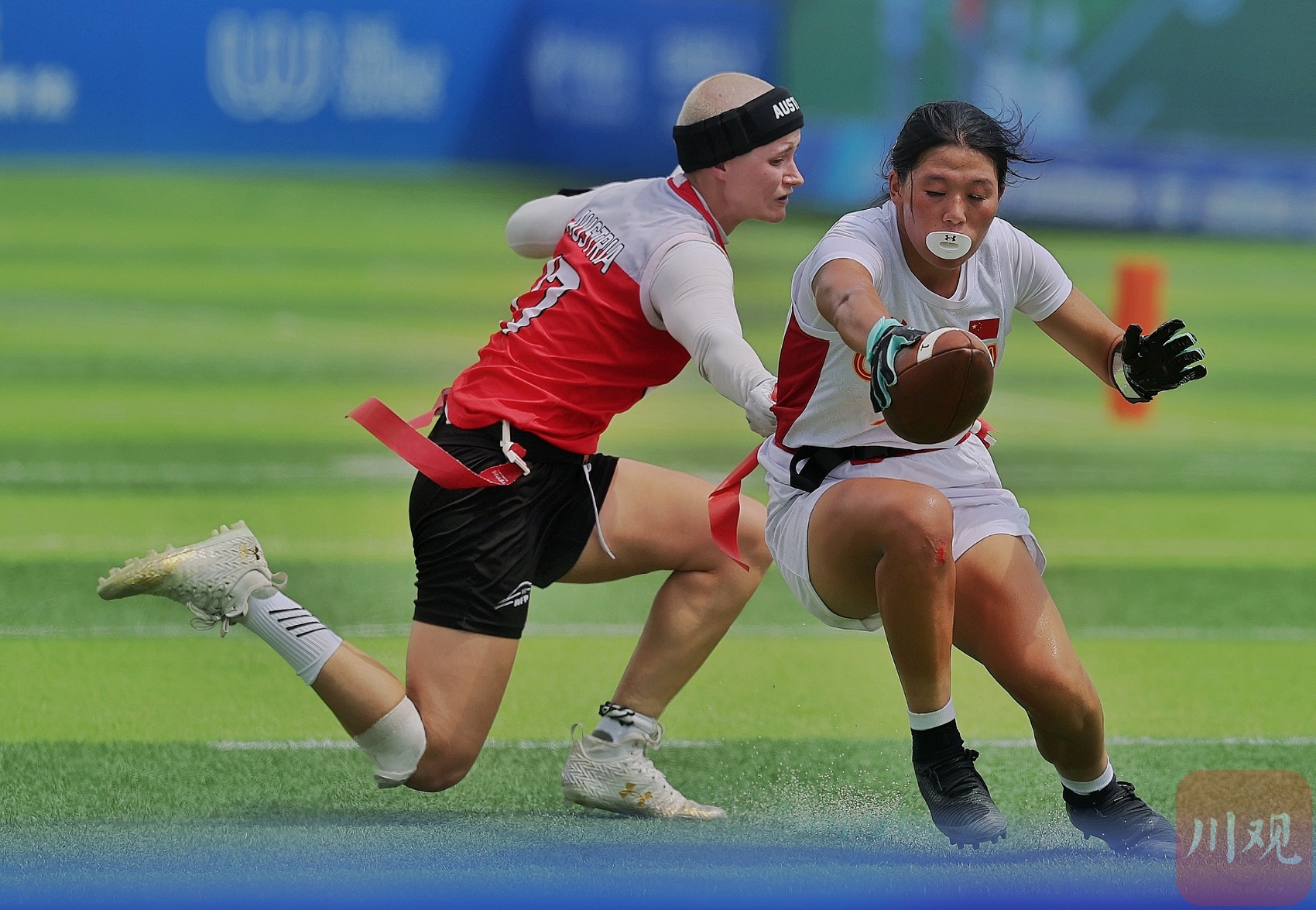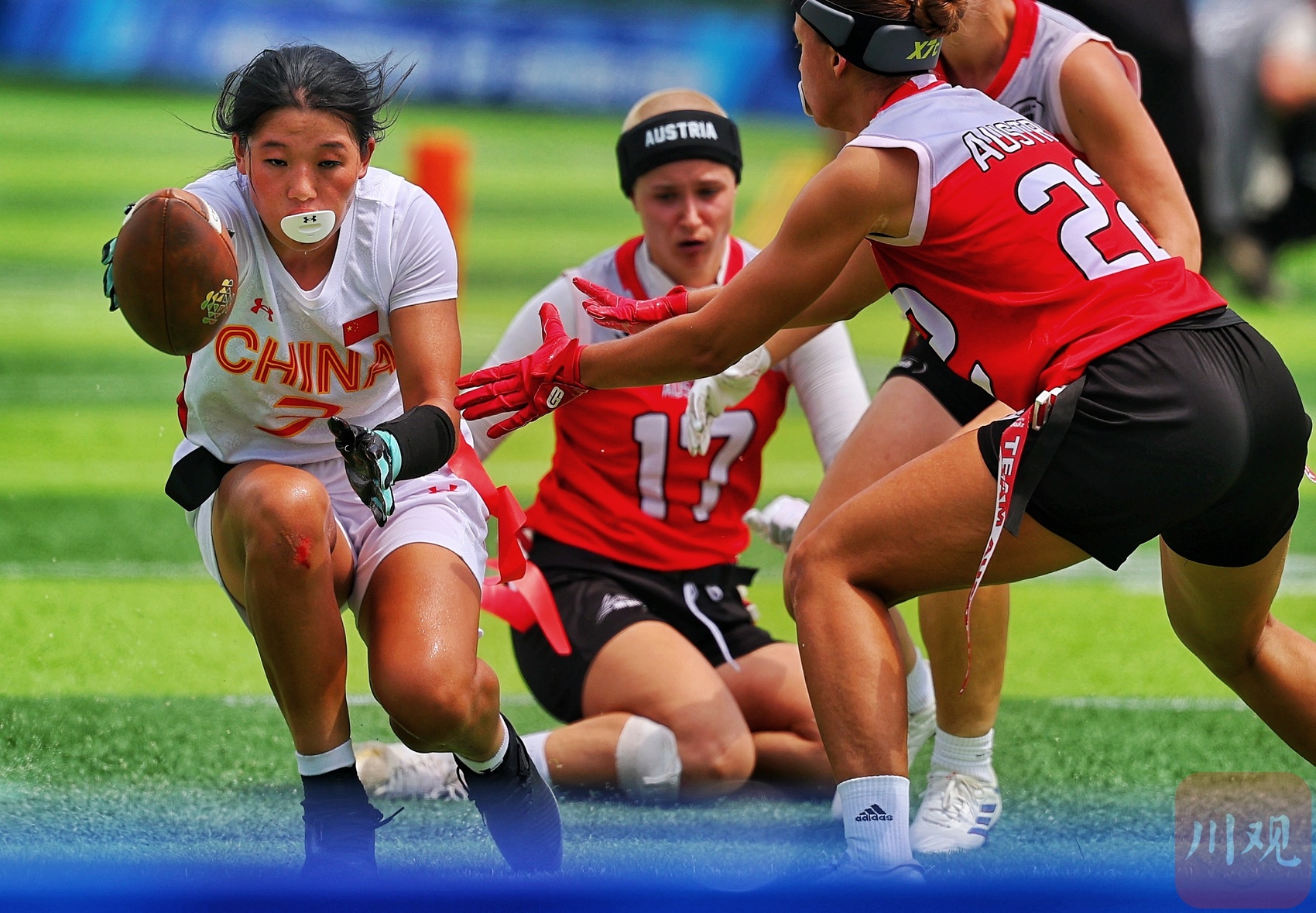 8月14日,成都2025世运会女子腰旗橄榄球赛在成都七中东部学校操场点燃战火。新组建的中国女子腰旗橄榄球队迎来历史性首秀,面对劲旅奥地利队敢打敢拼,最终以45:47的微弱差距惜败对手。